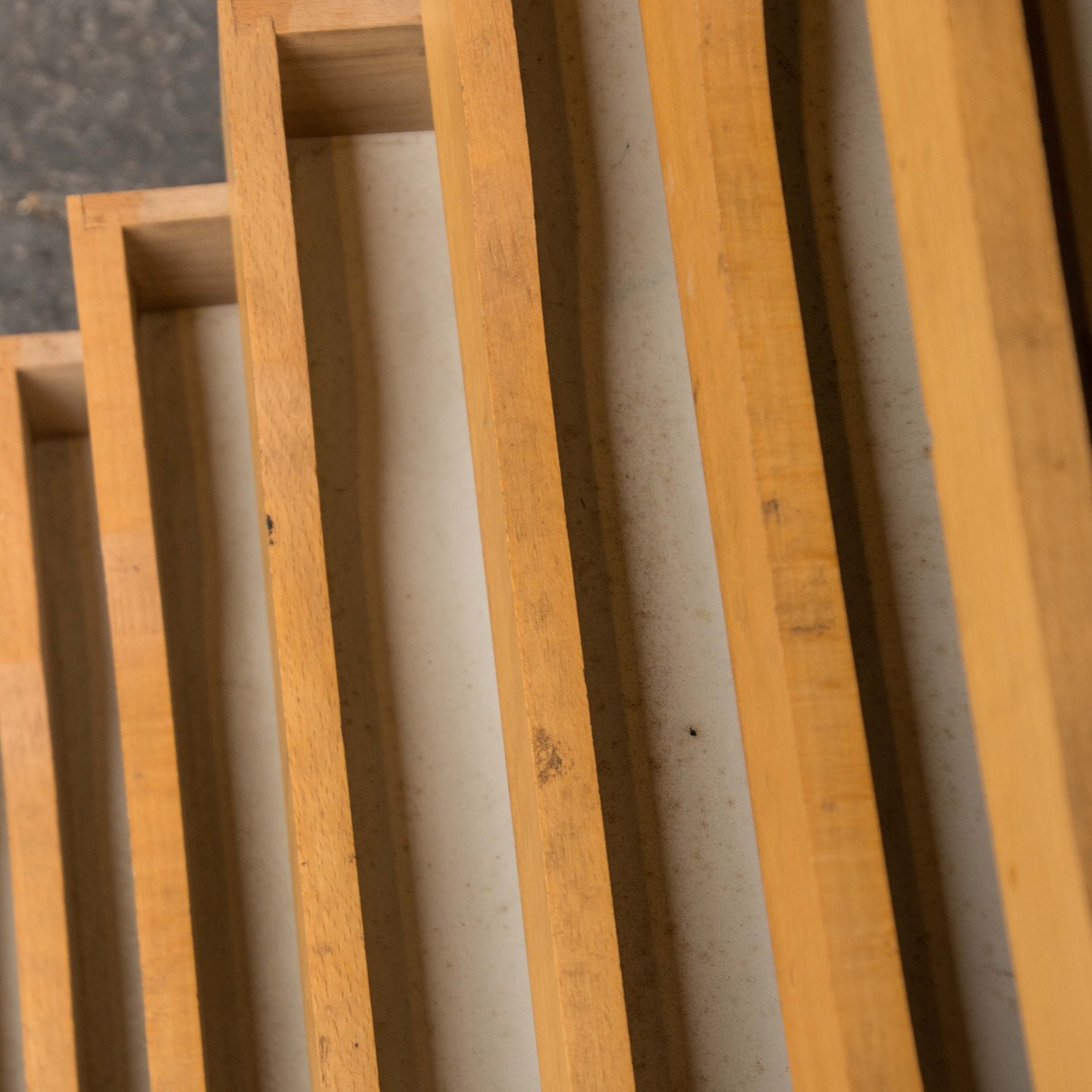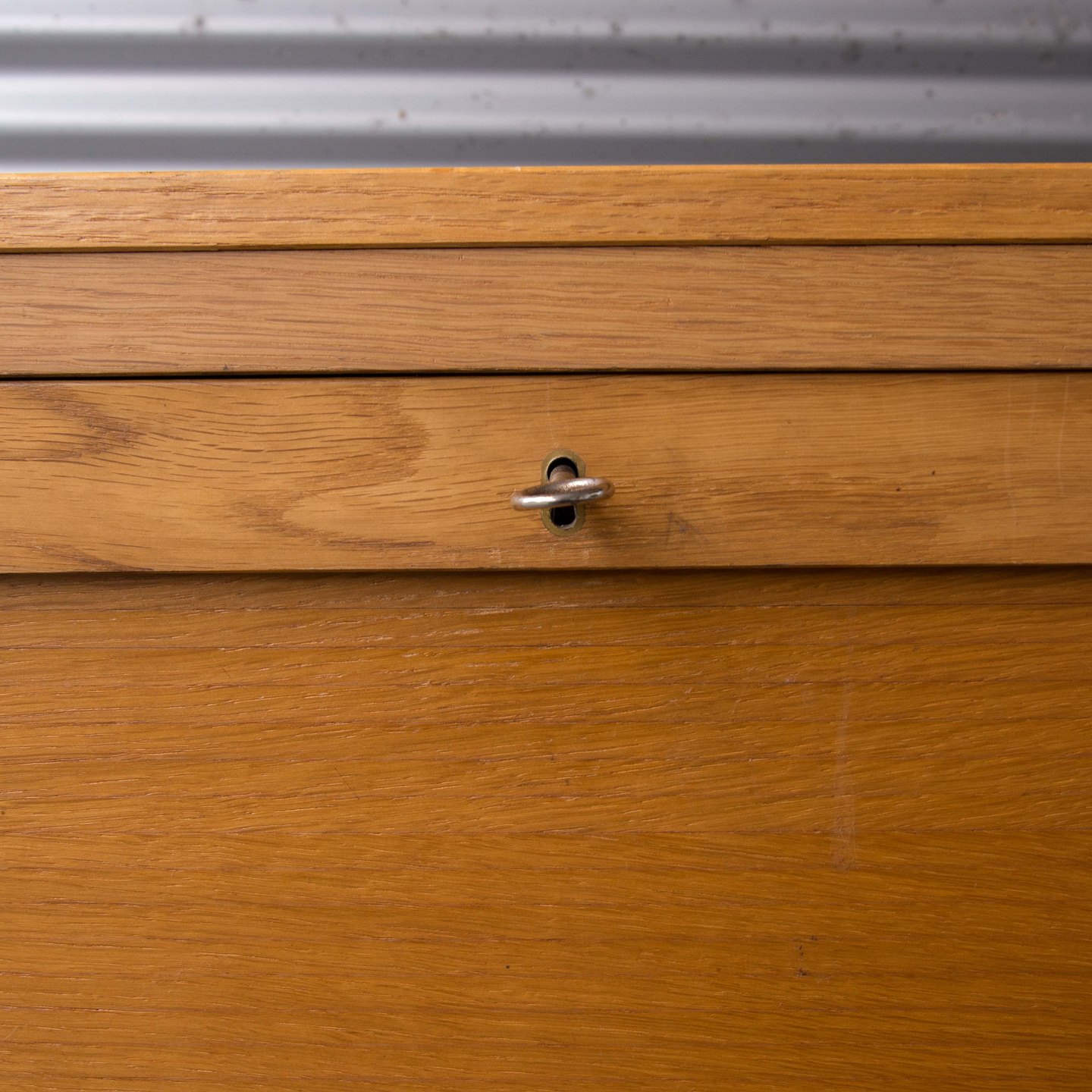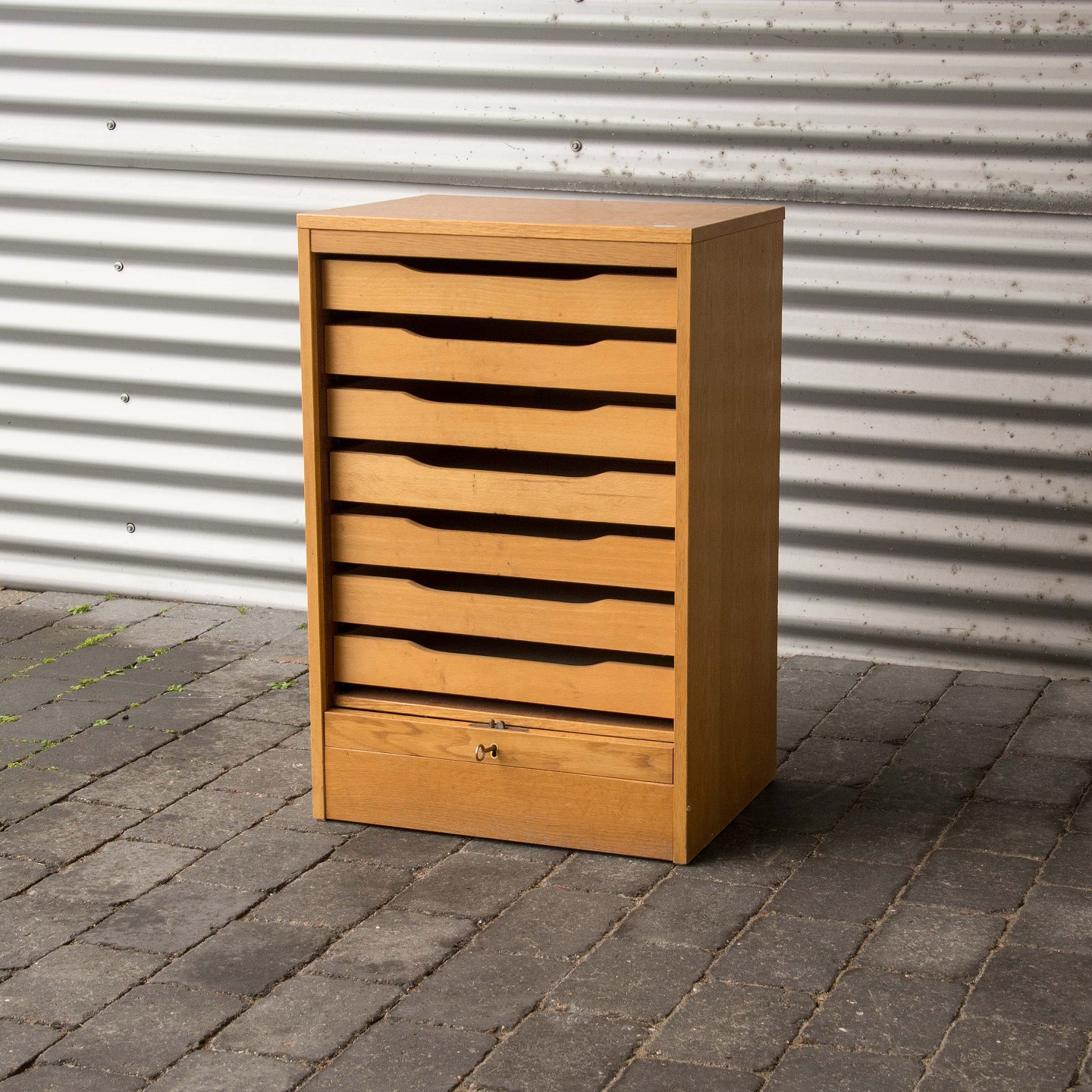 Arkivskab i lakeret egetræ med syv skuffer og jalousilåge