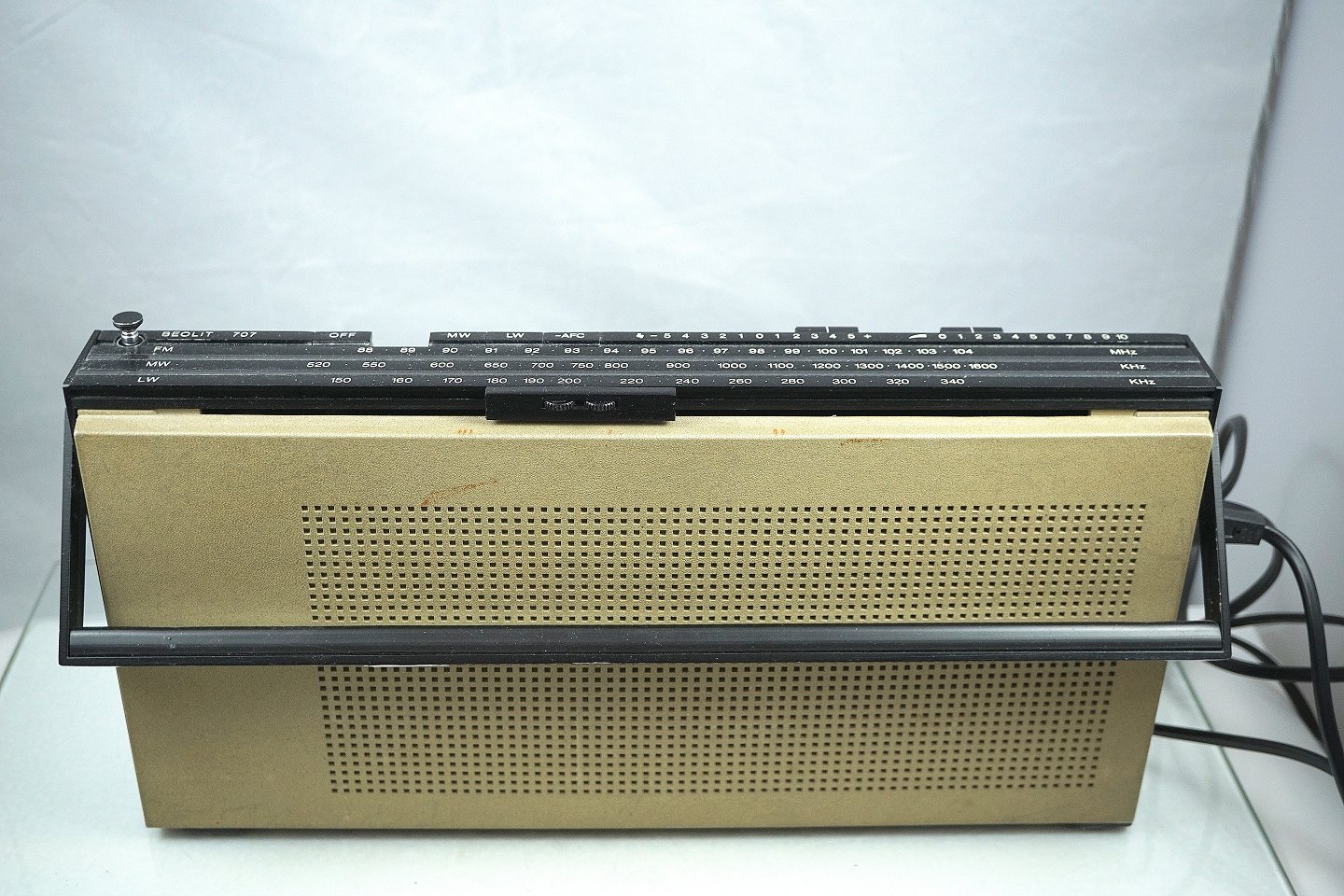 B&O, transistorradio model 707, modelnr. 9960. Radioen er intakt med ledning og antenne. Farven på radioen er grå. BeoLit 707 er formgivet 1978. Transistorradioen virker.