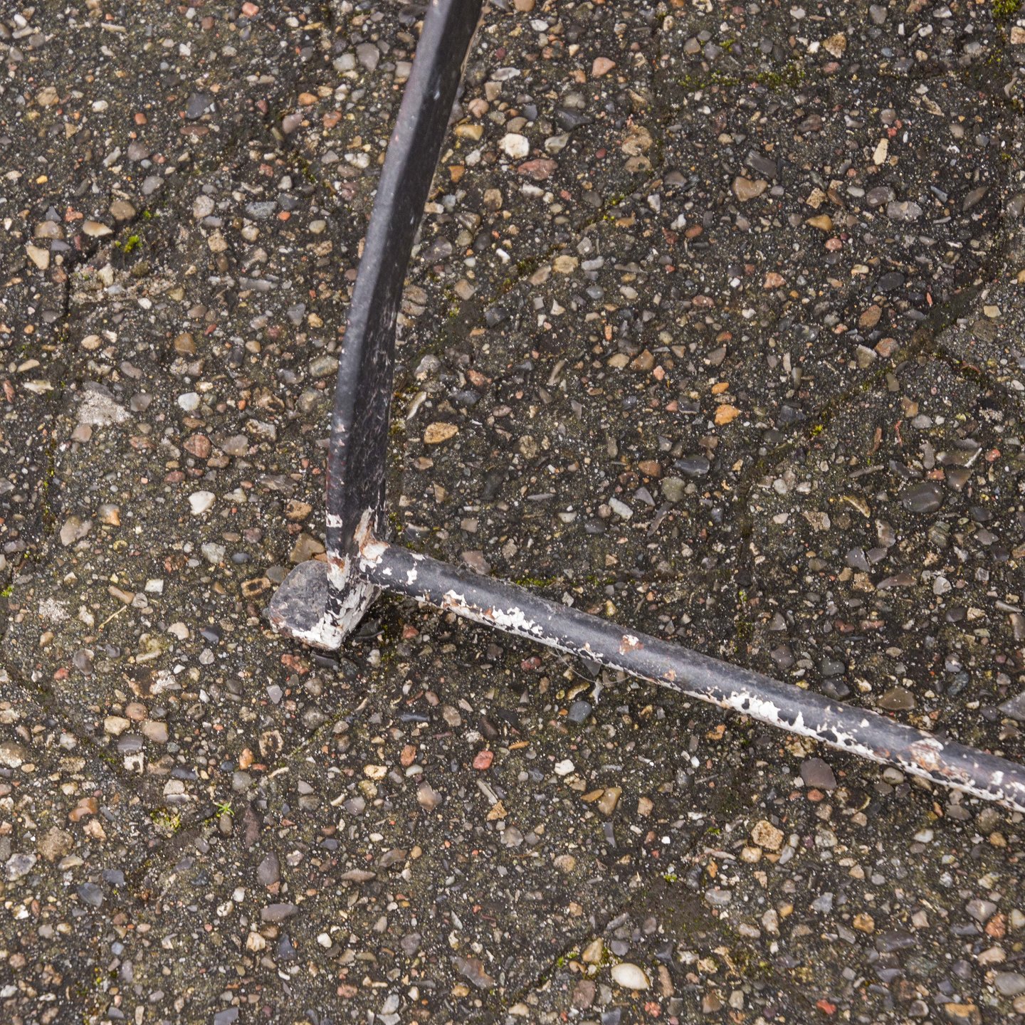 God stand med brugsspor på metalstel samt mærke efter knast i træsædet.
