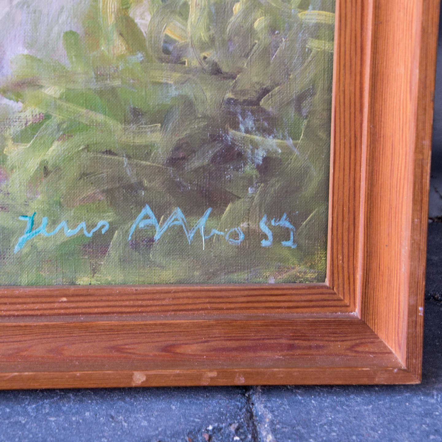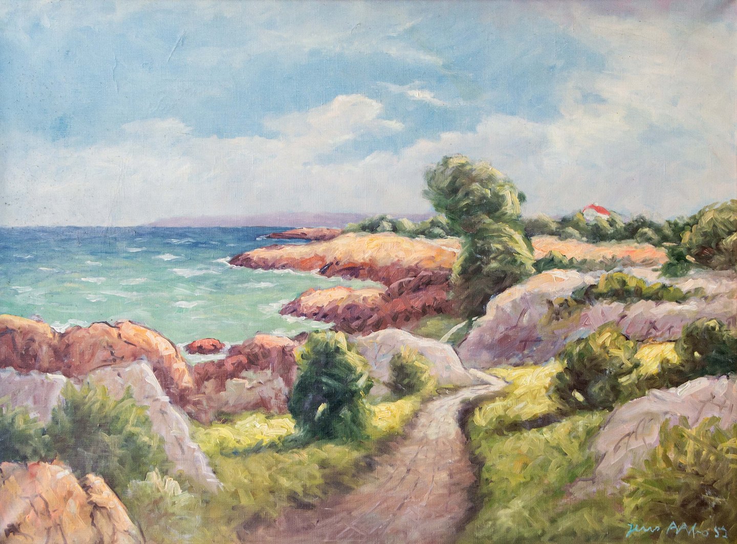 Landskabsmaleri med naturmotiv af sti langs kystlinje 1957