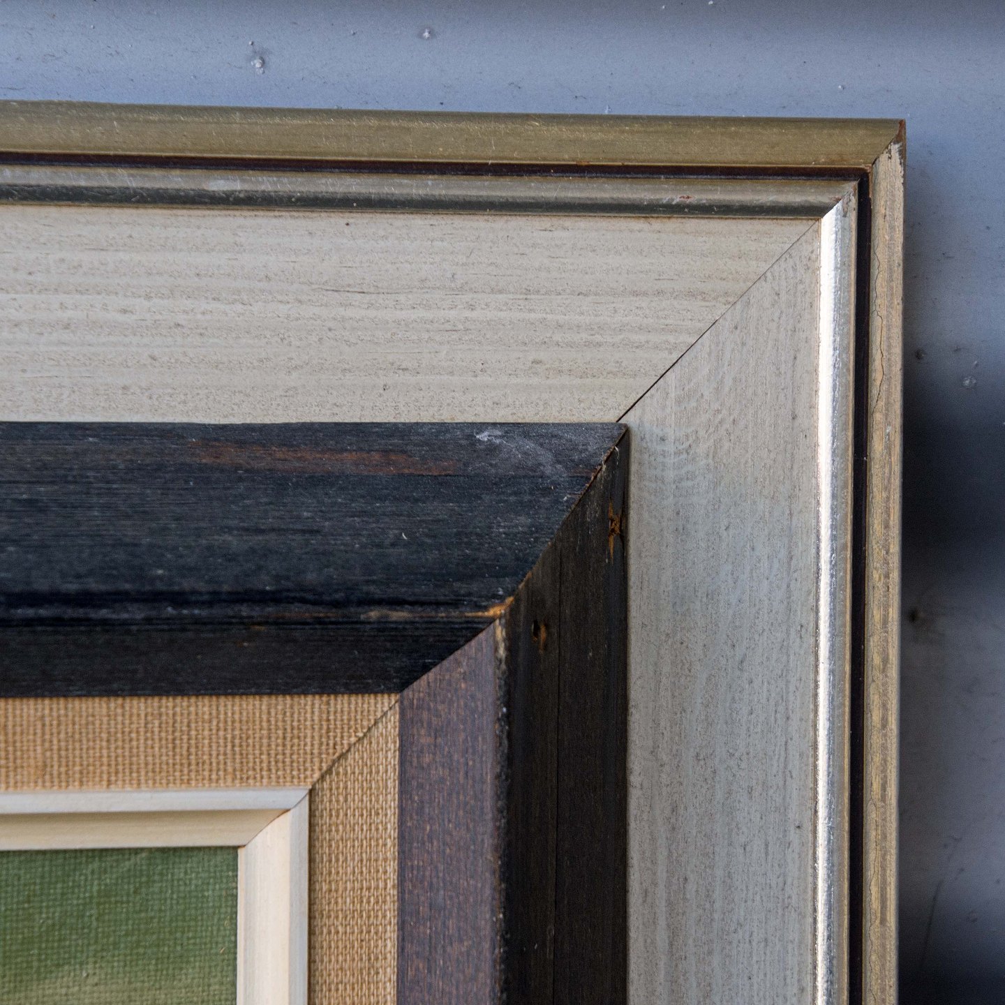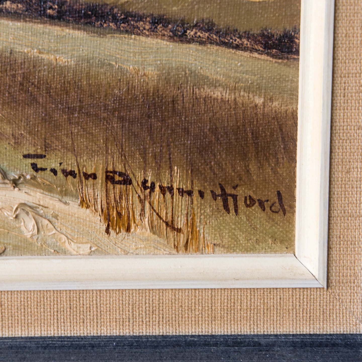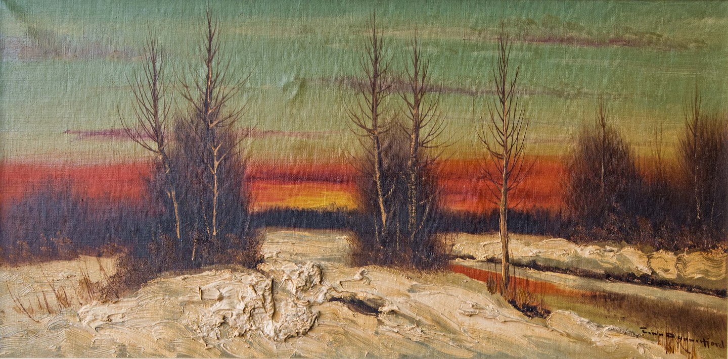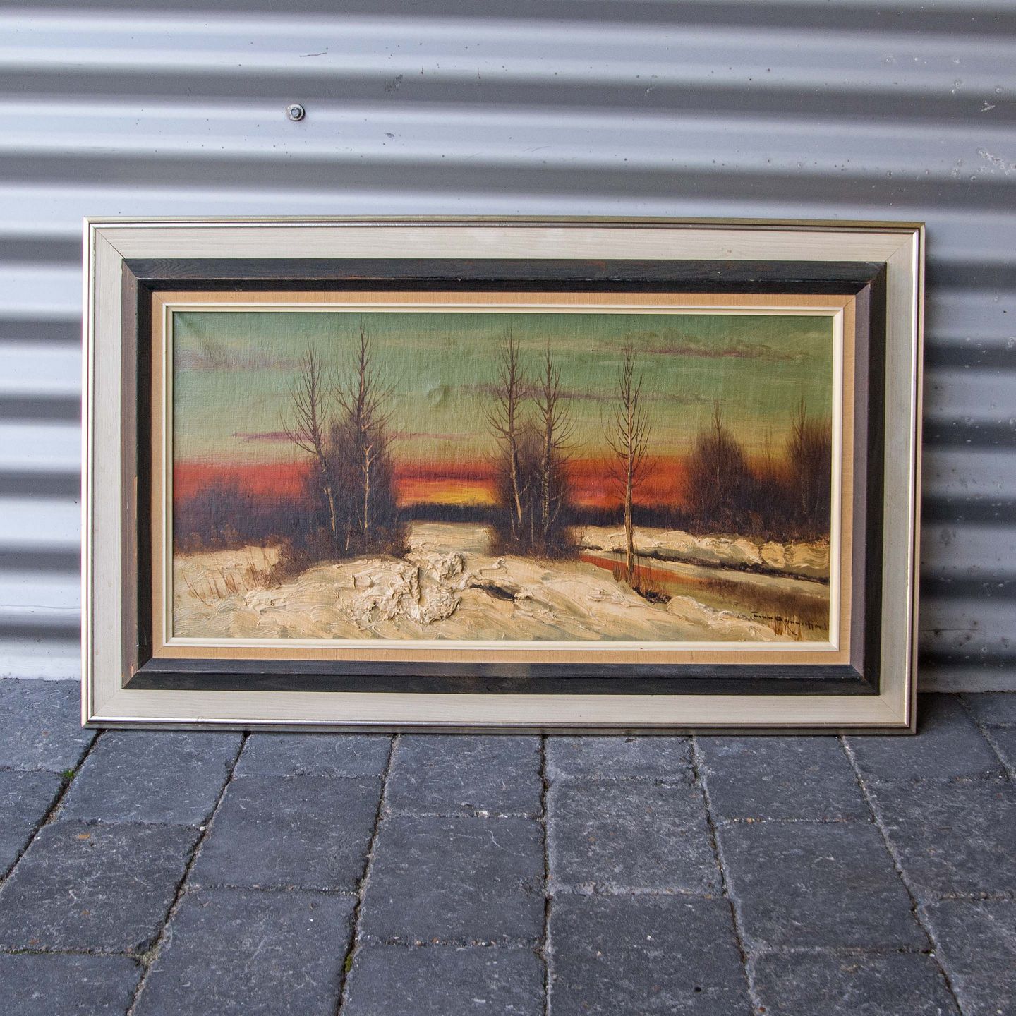 Maleri af skov i sne, med solnedgang. Olie på lærred i ramme.