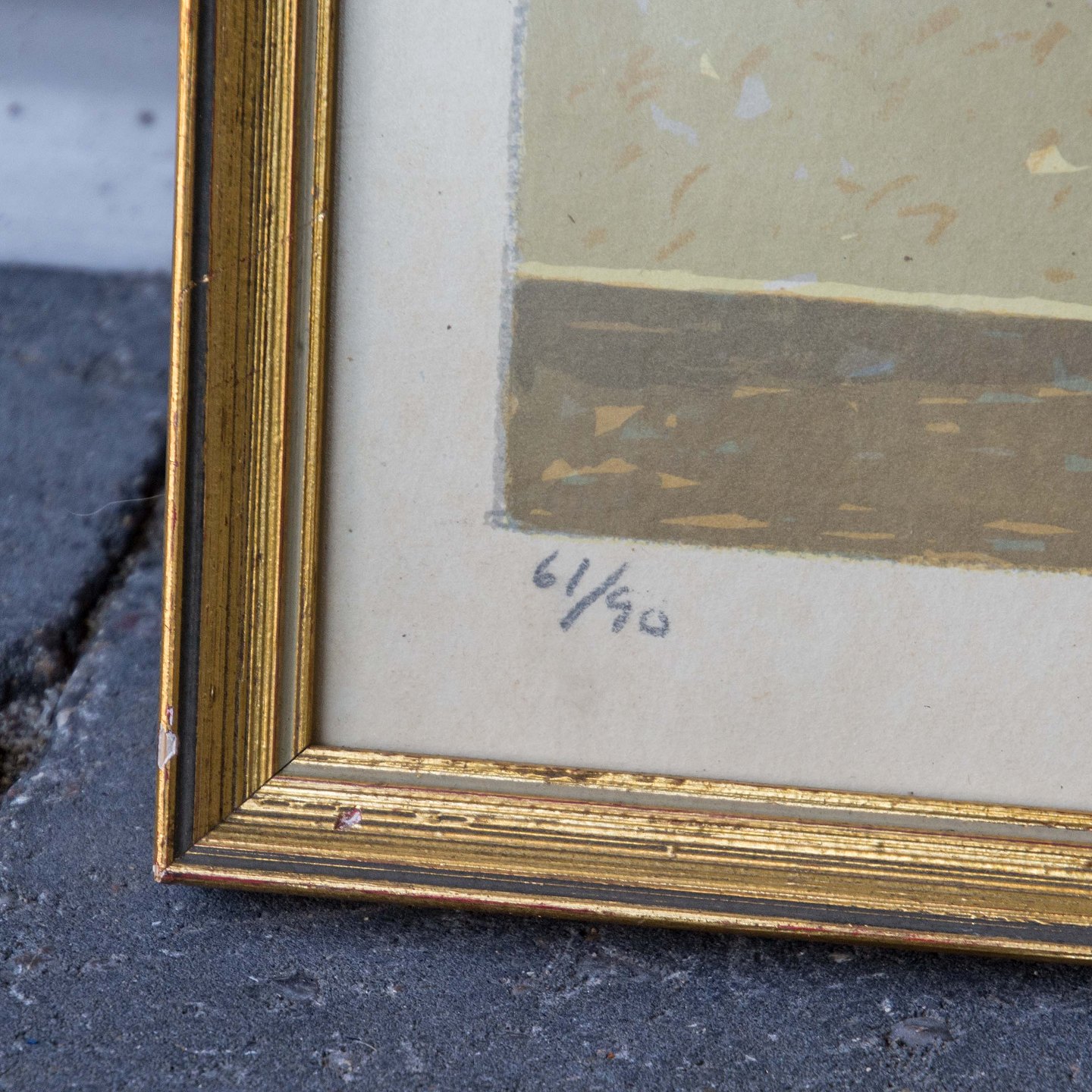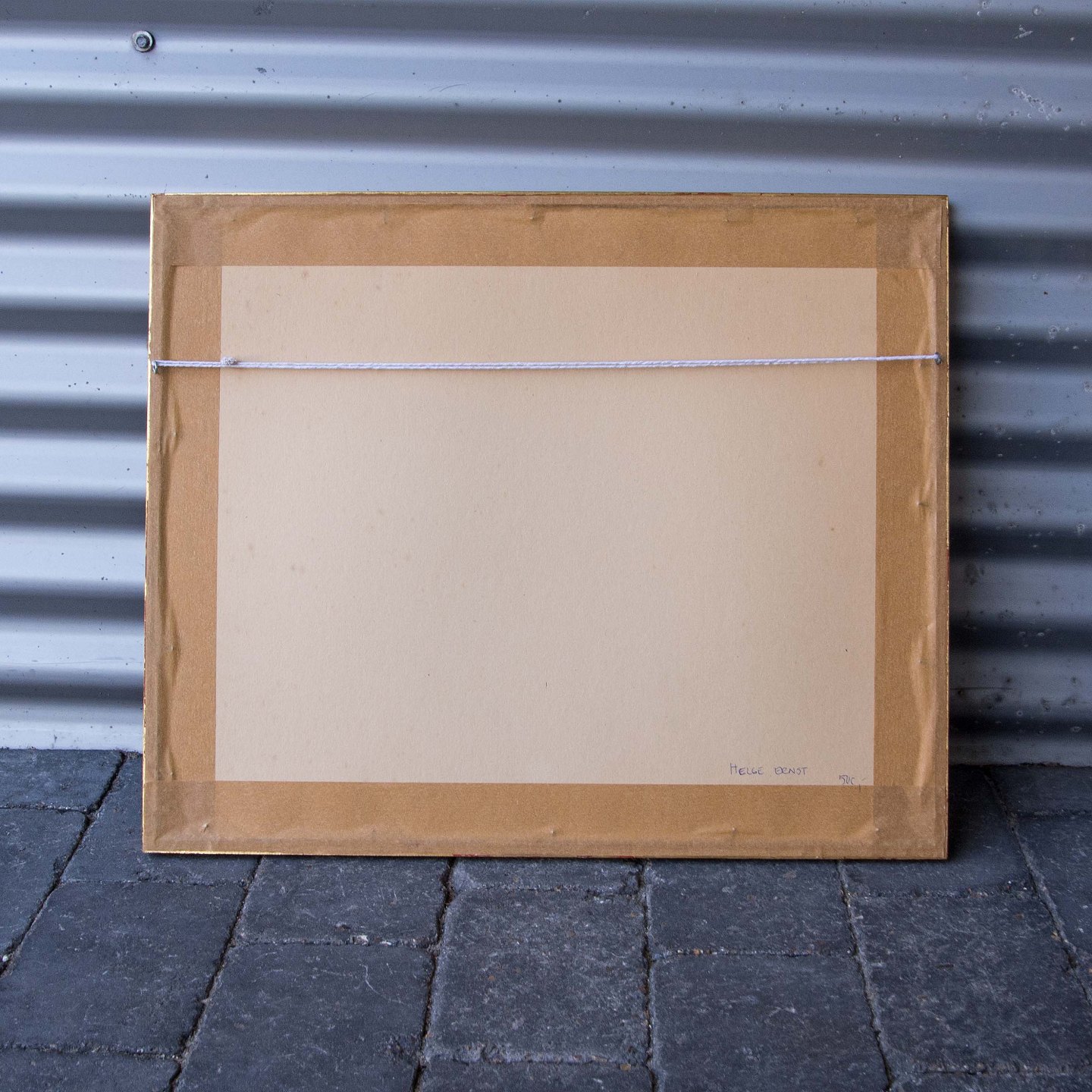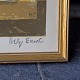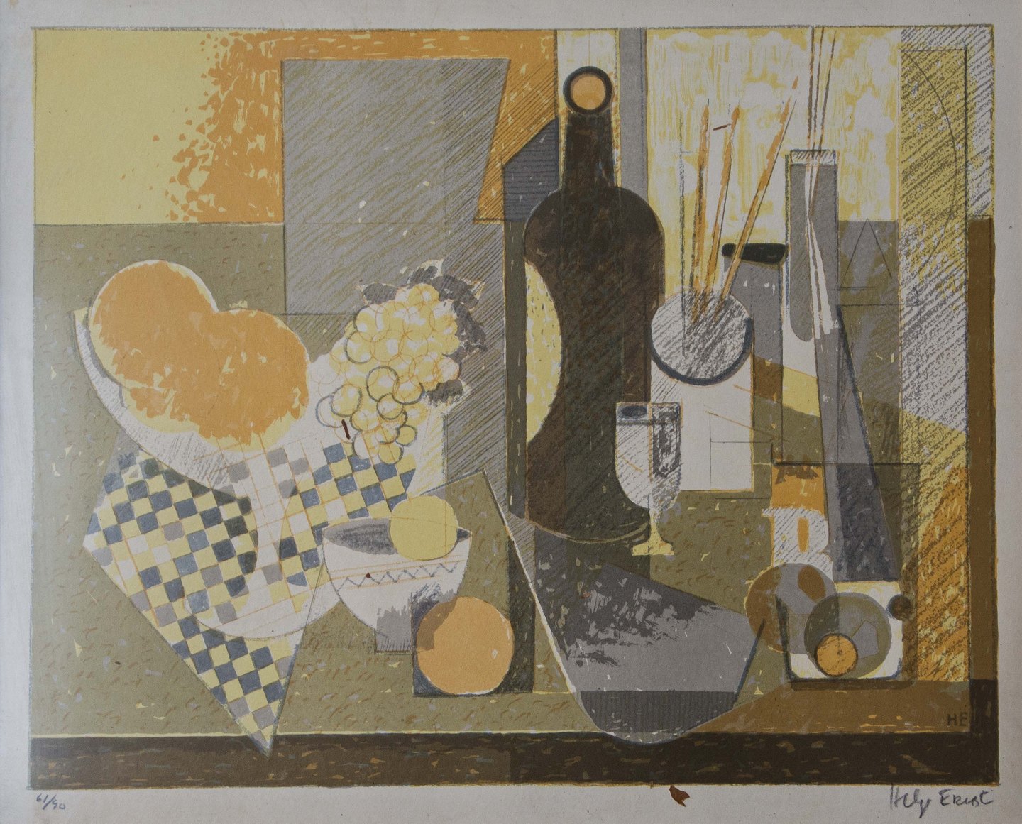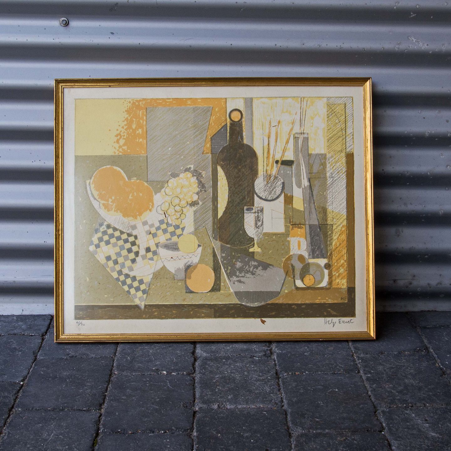 Litografi af flaske mm på bord, i ramme og glas. Signeret HE 61/90