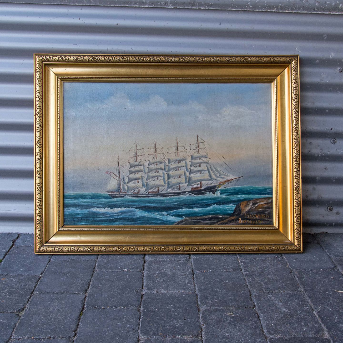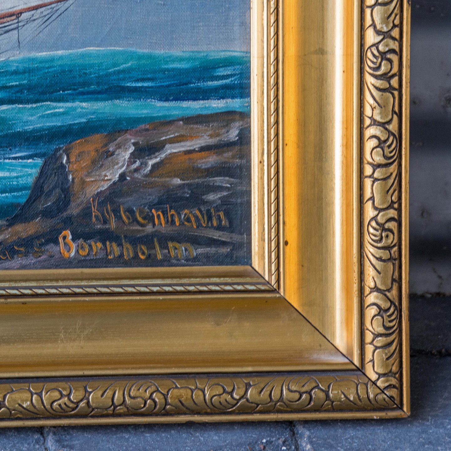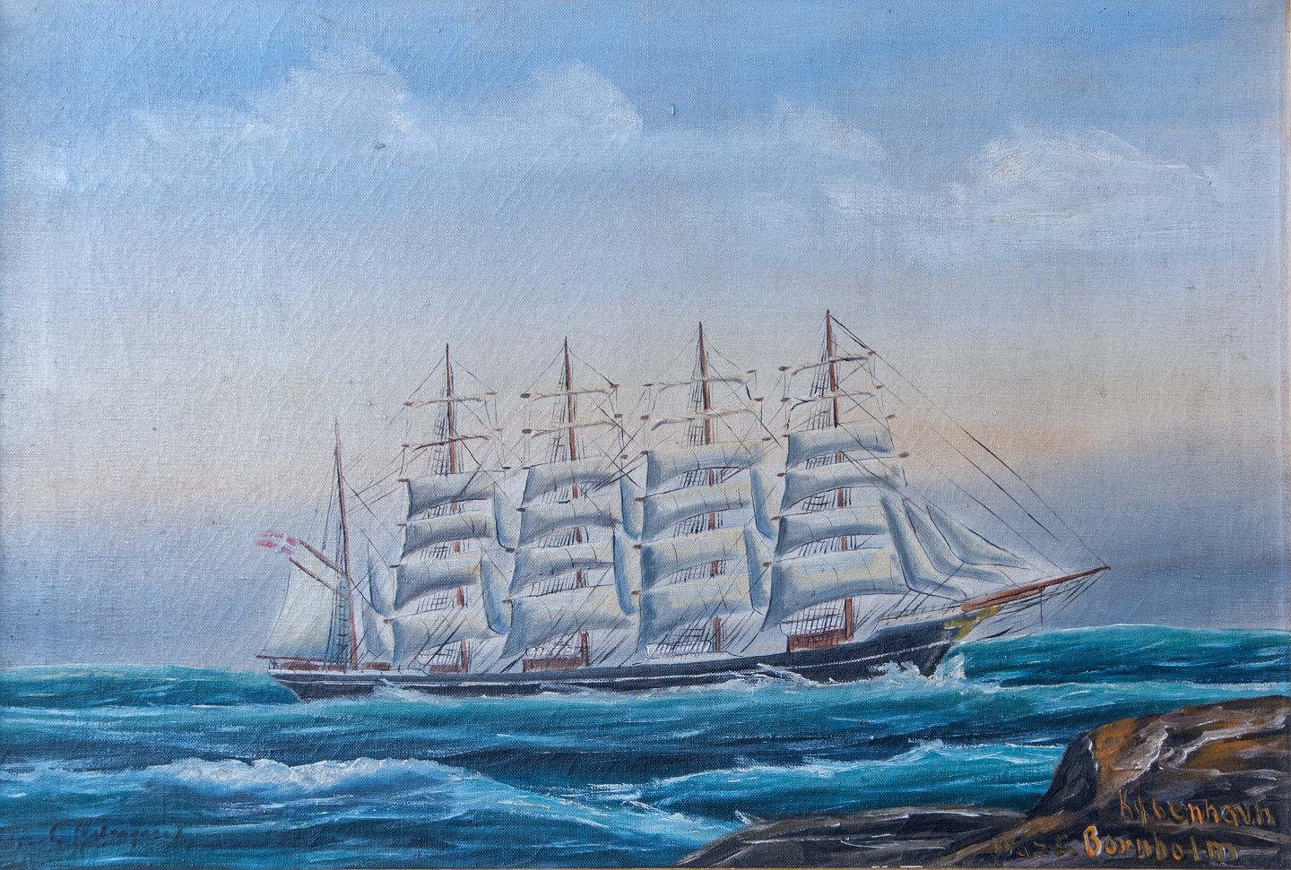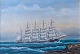Maleri af Skoleskibet København (forliste 1928) Olie på lærred i guld ramme.