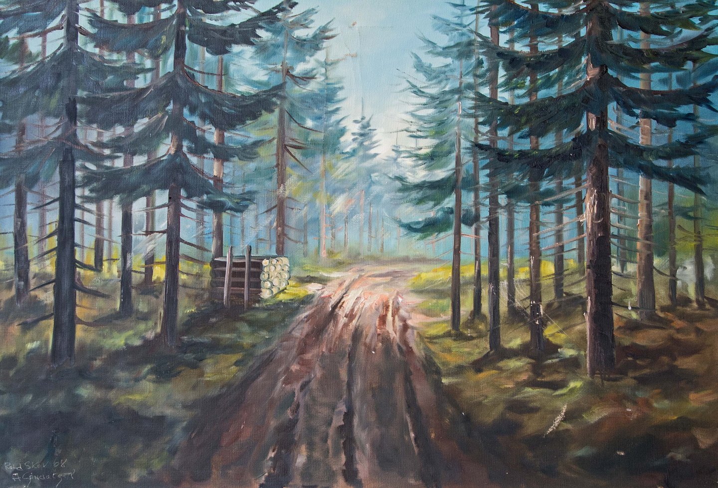 Maleri fra Roldskov, træer ved skovvej fra 1968.