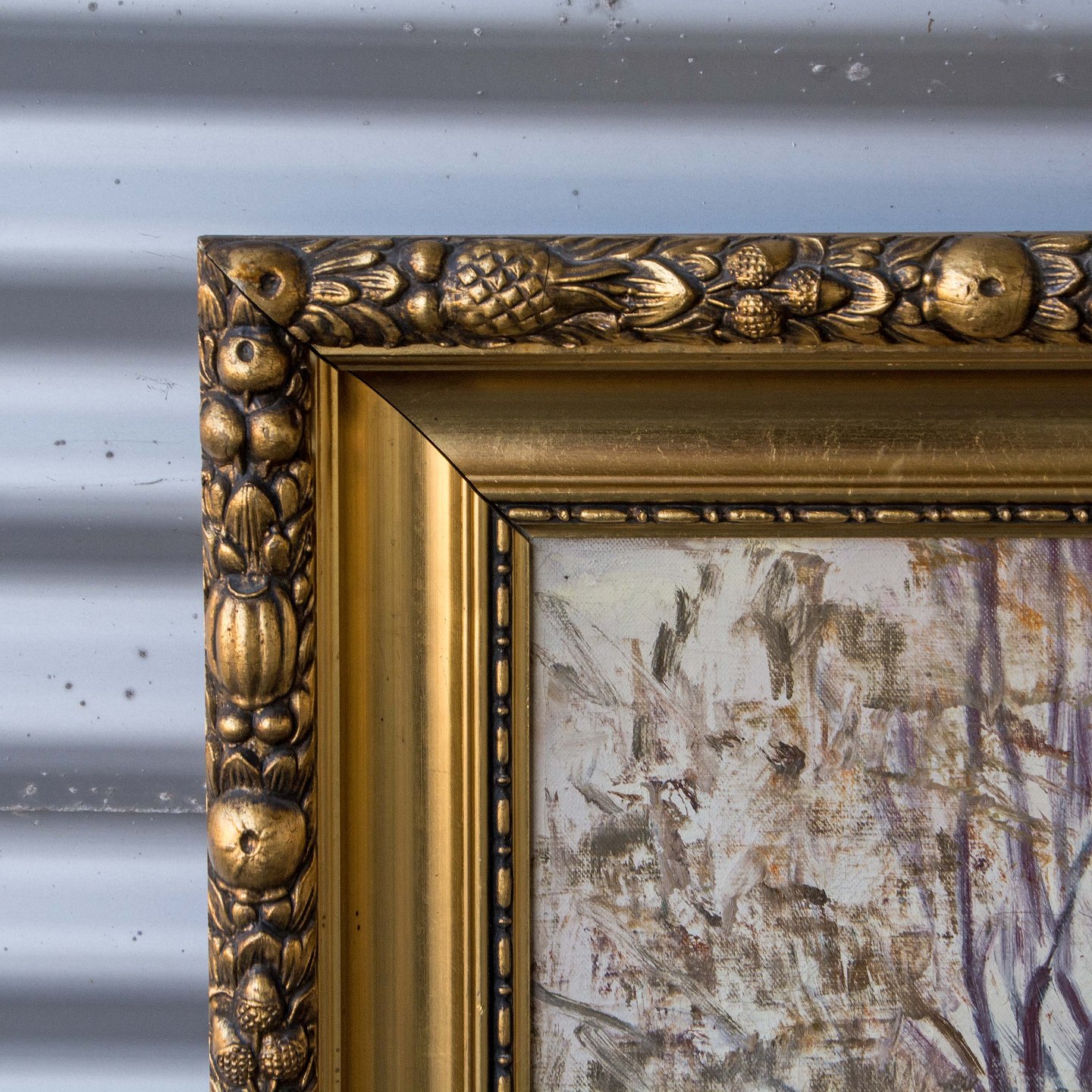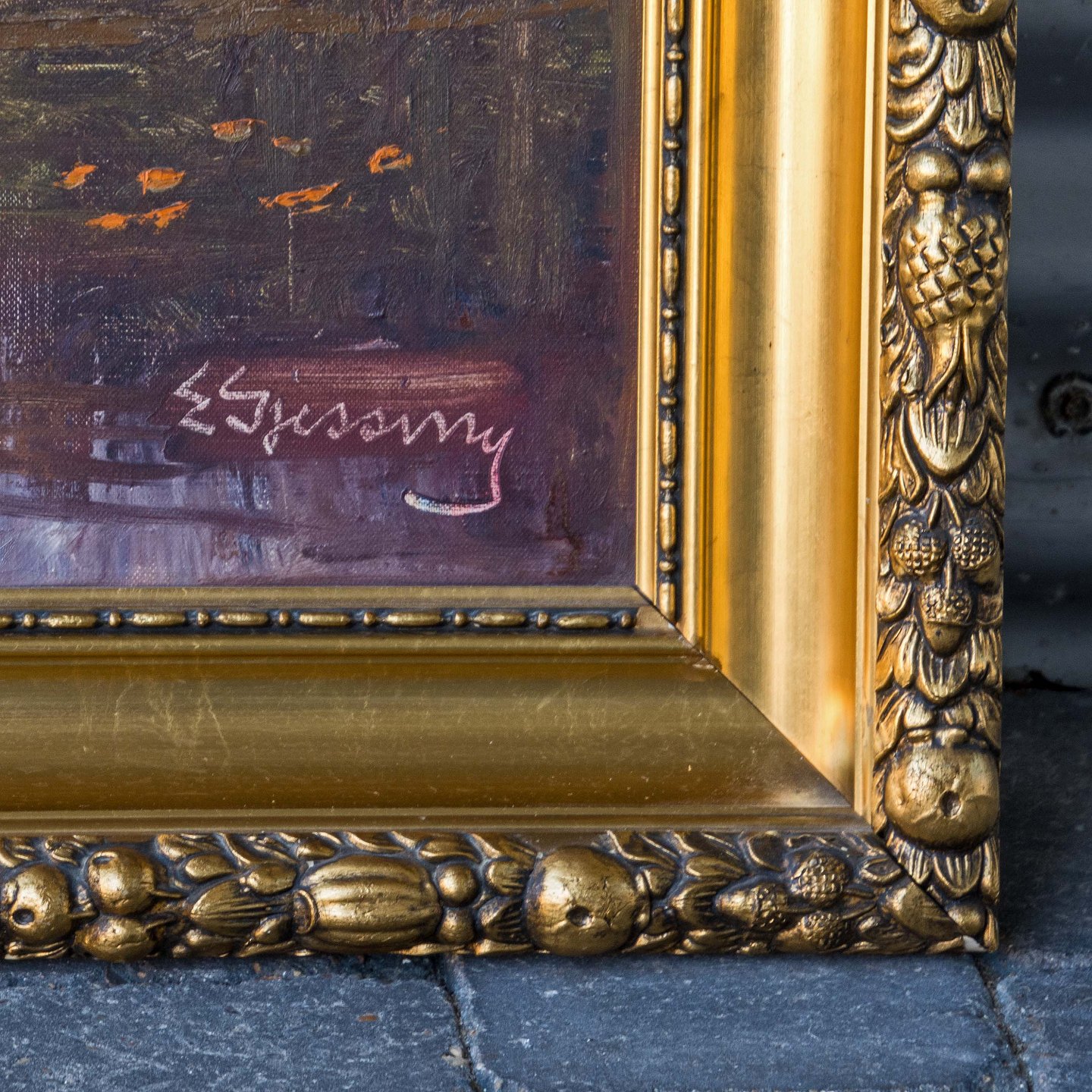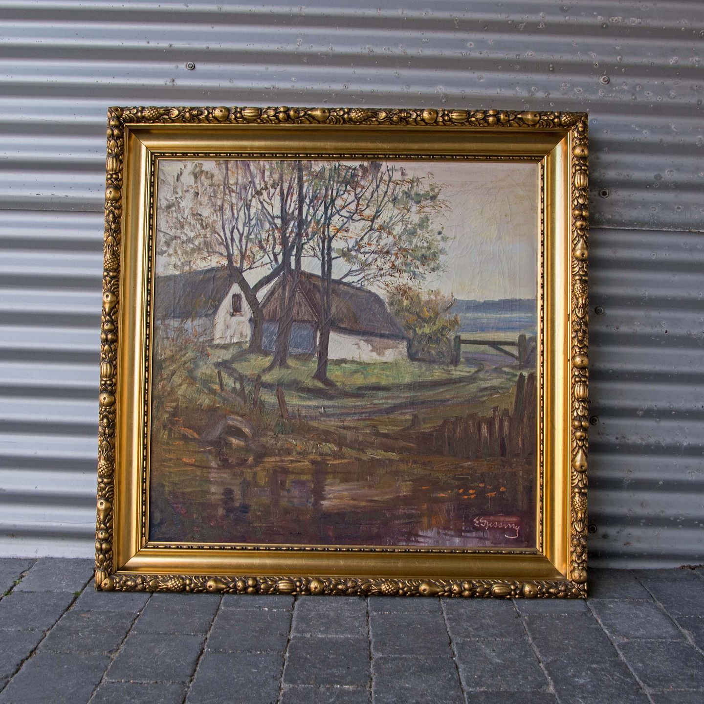 Maleri af gård ved sø, Olie på lærred med guldramme.