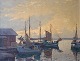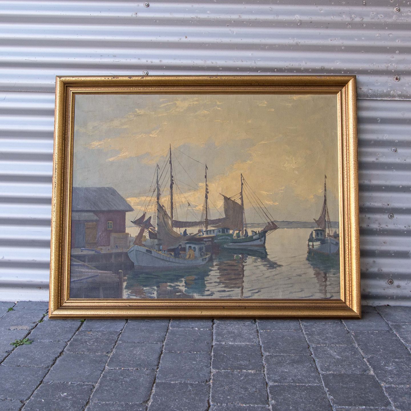 Maleri af skibe i havn, olie på lærred.