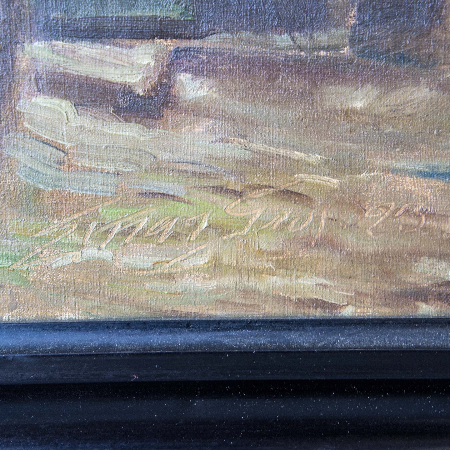 Eksteriør maleri med motiv gårdmiljø med bindeværkshuse