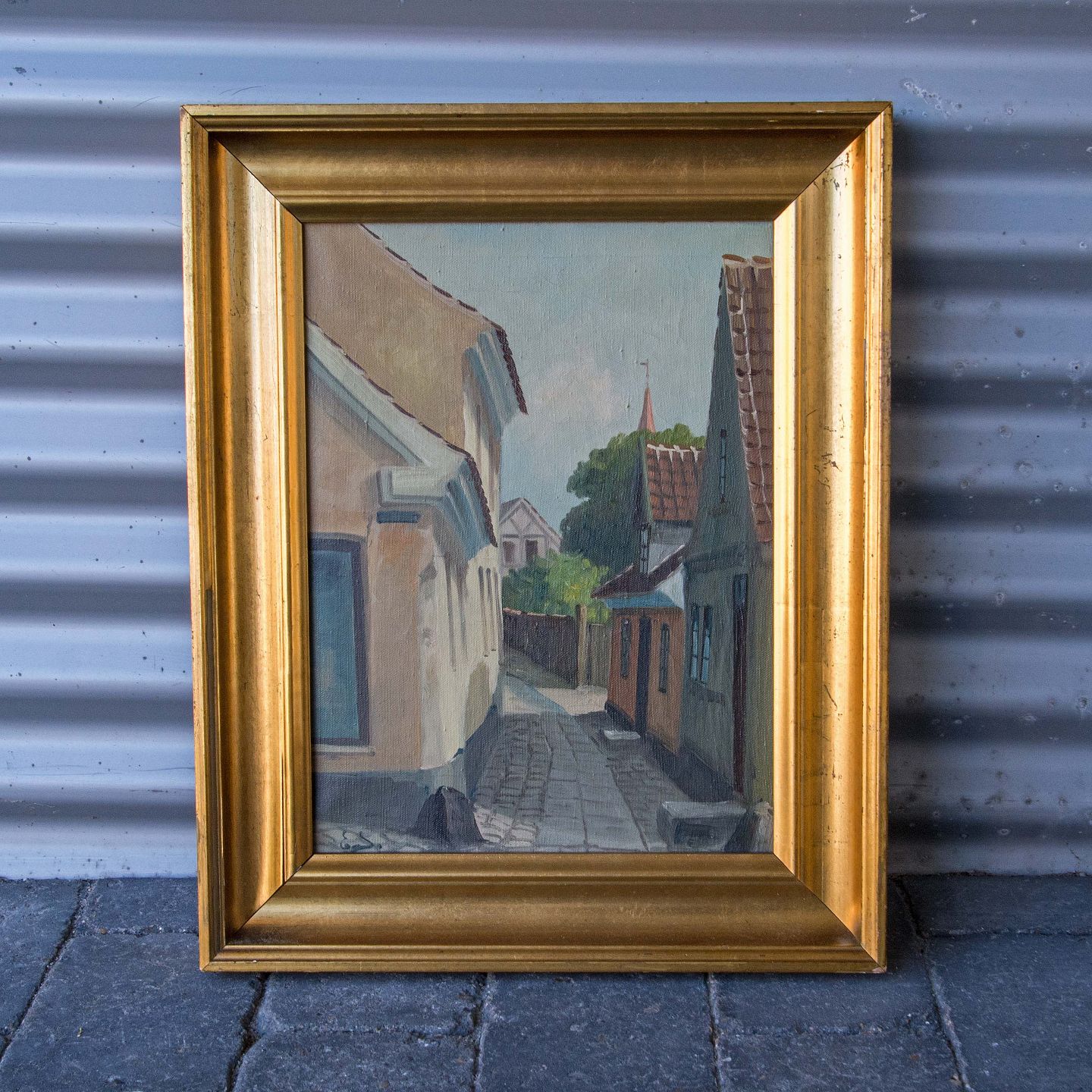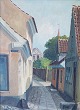 Eksteriør maleri med motiv fra bygninger på gade i Aalborg