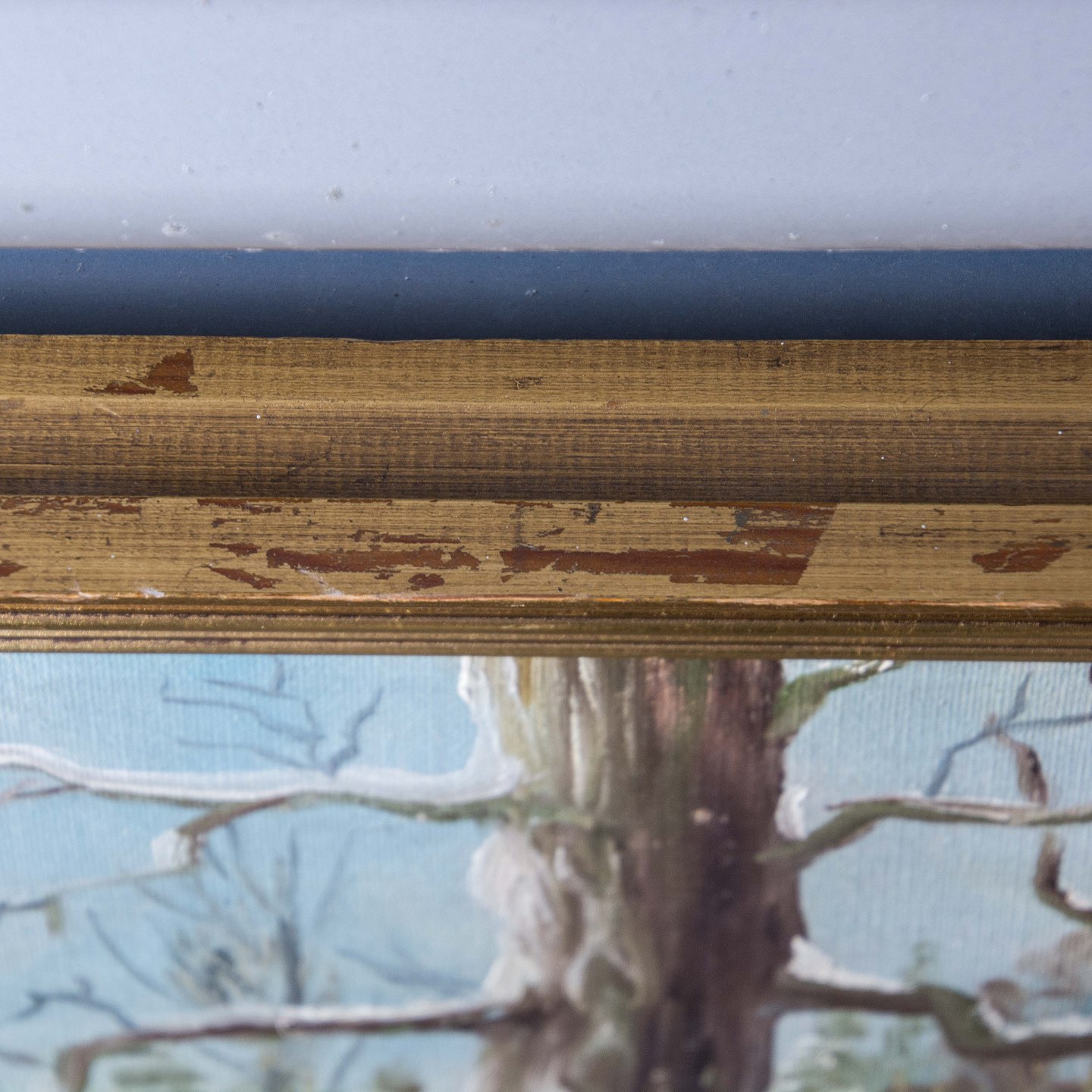 Landskabmaleri med naturmotiv af snedækket landskab ved sø