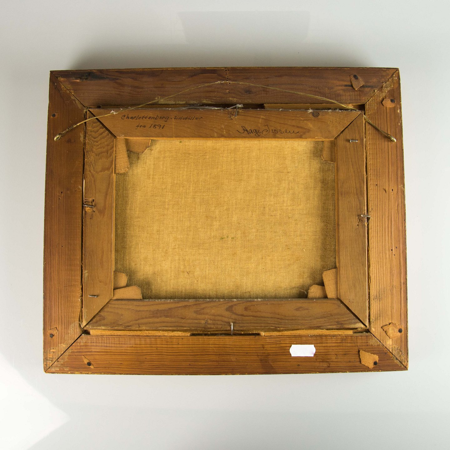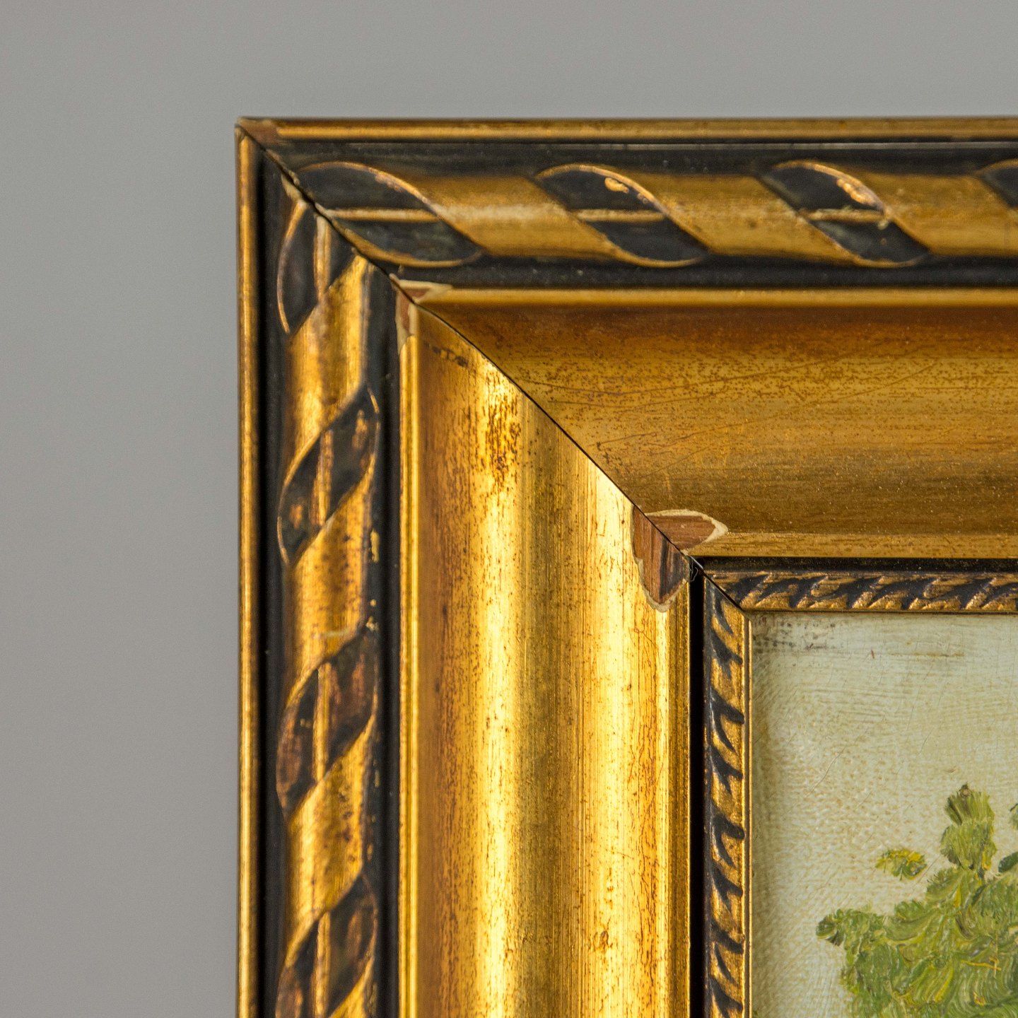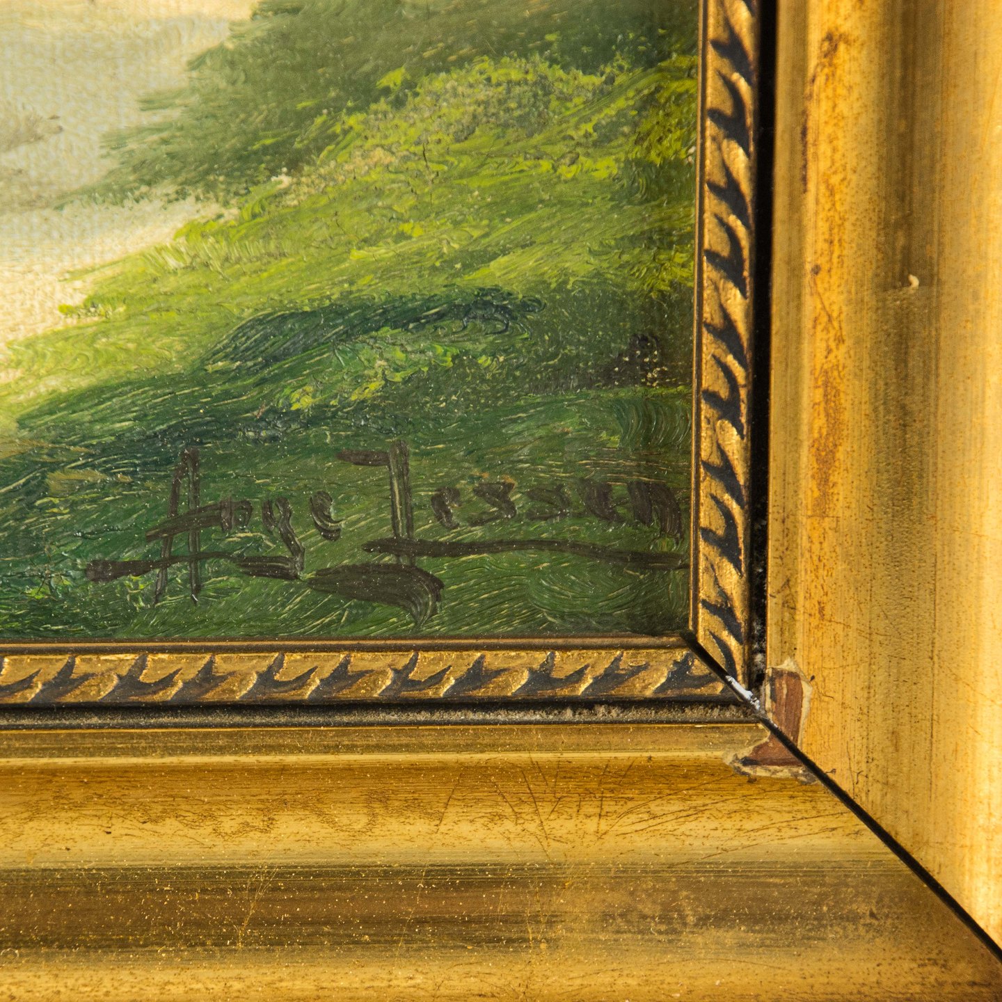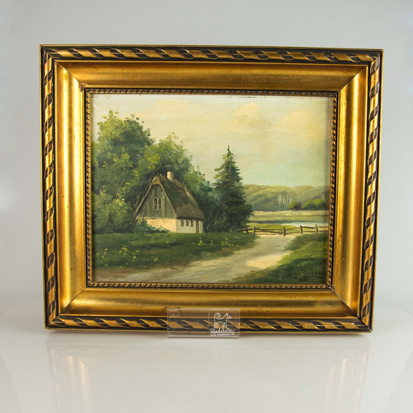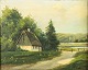 Landskabsmaleri med motiv stråtrækt hus ved indhegnet område