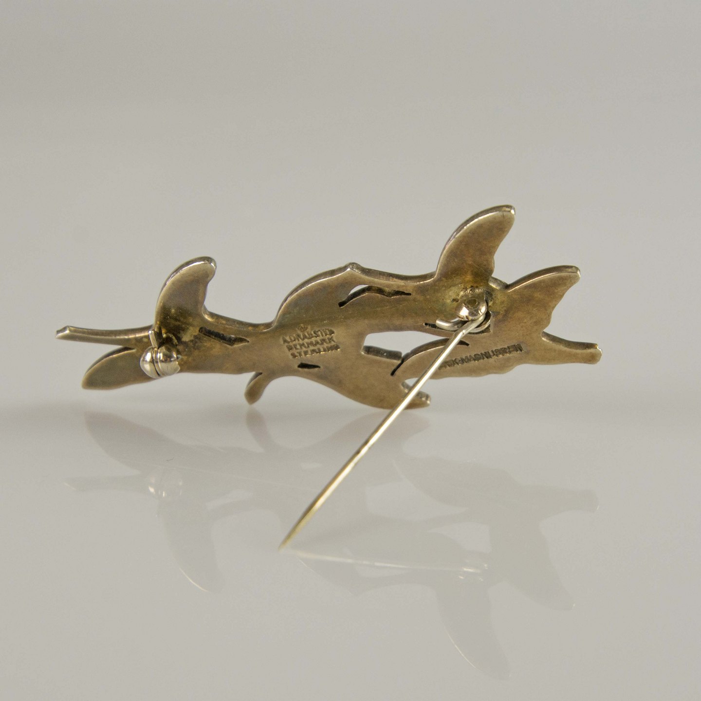 Broche i sølv og emalje med motiv af fem flyvende svaner