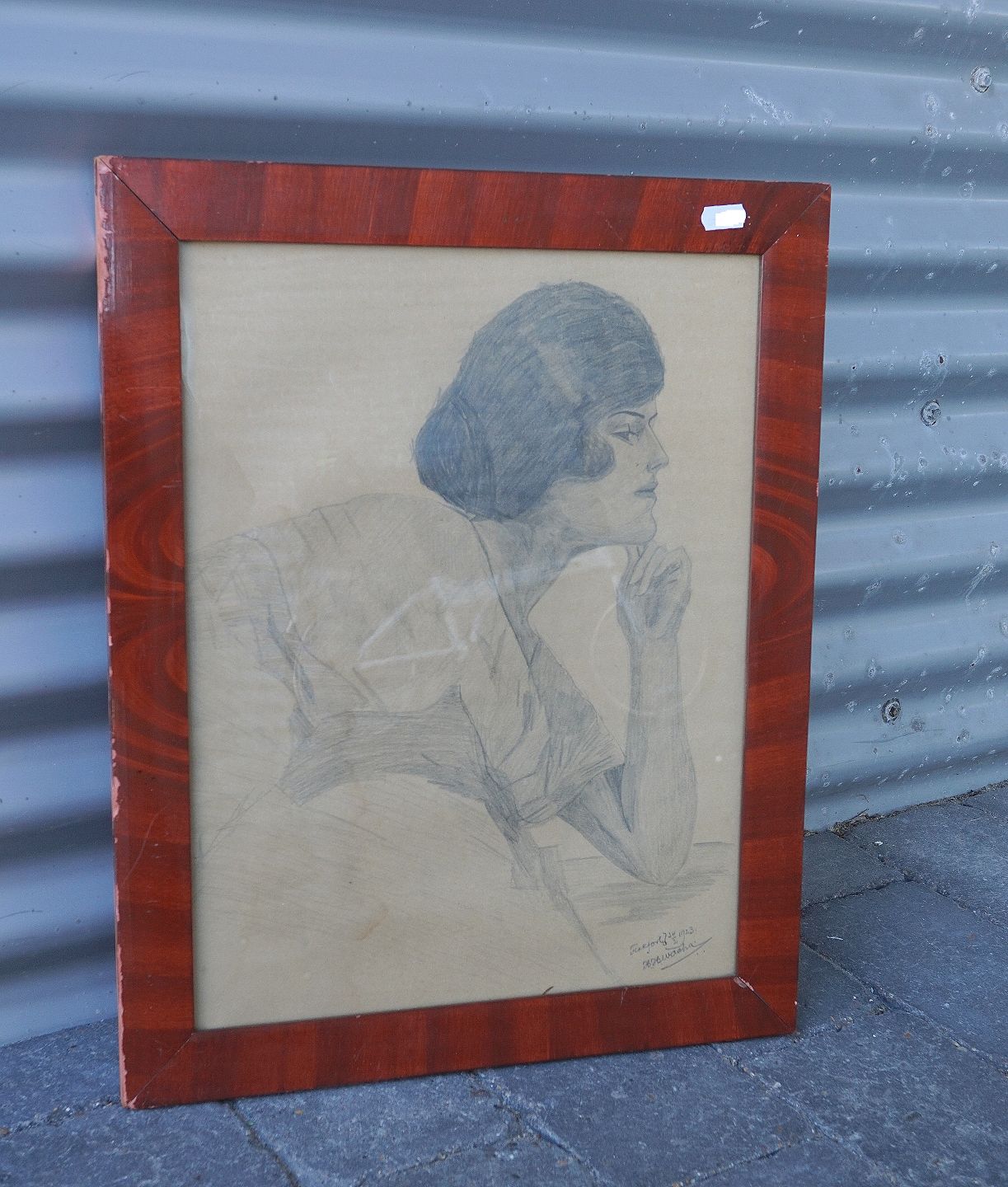 Tegning af tankefuld dame, tegningen er udført på Flakfortet. Tegning 24/2, signeret H H Wacher 1923