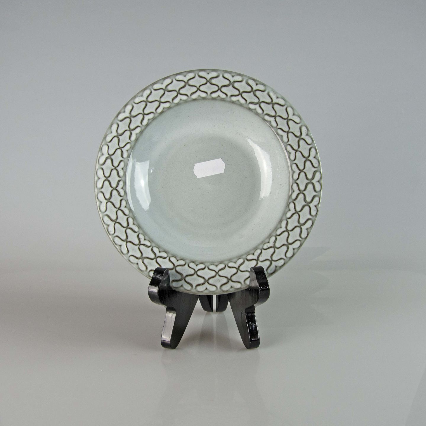 Mindre tallerken i gråt stentøj med abstrakt motiv.
