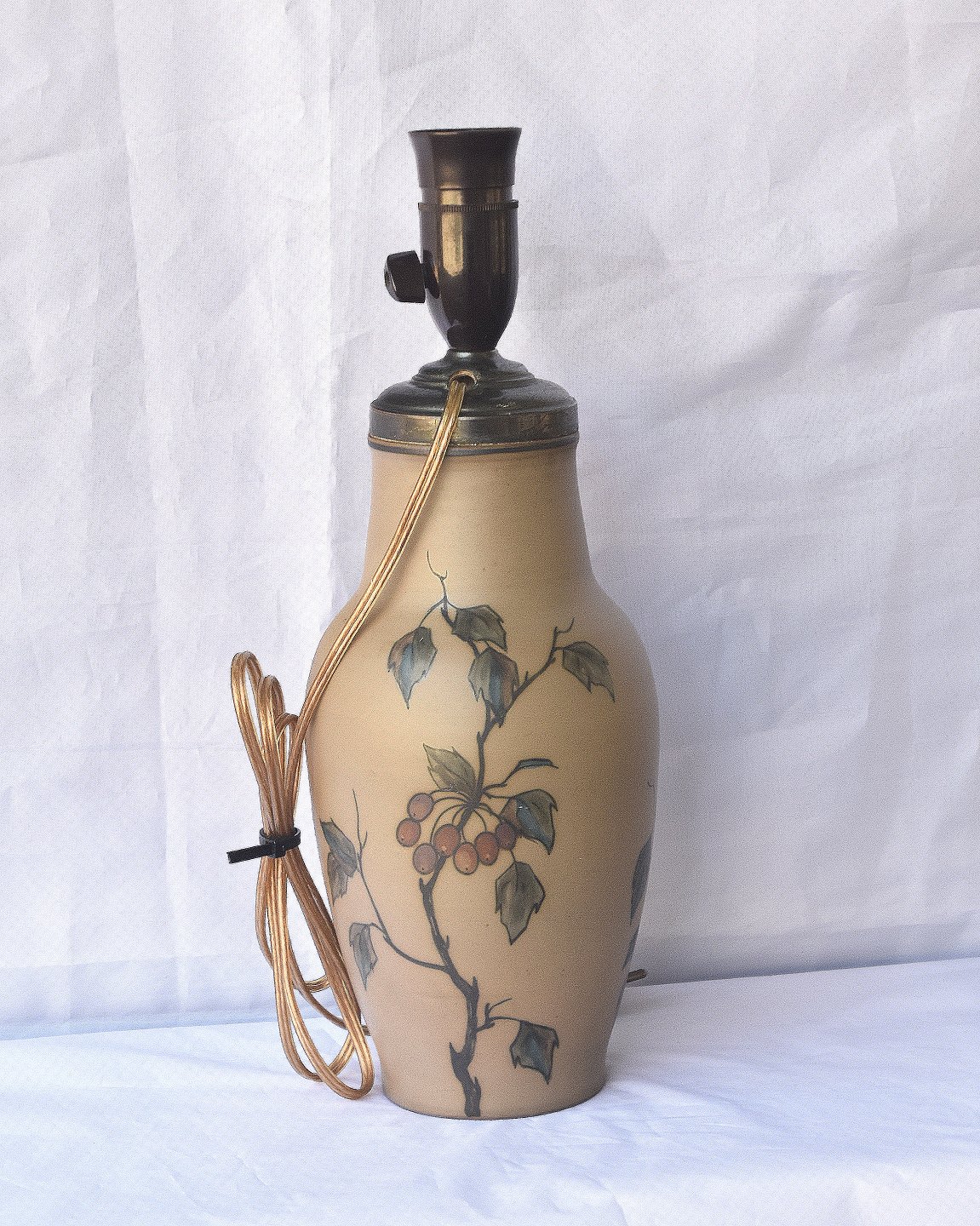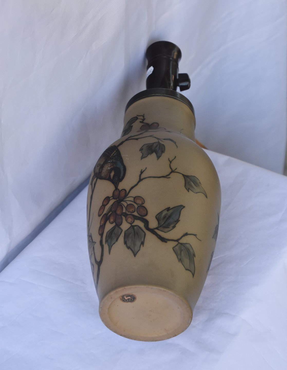 Fog & Mørup bordlampe. Dekorationen er en fugl, der sidder på en gren og spiser bær. Design L. Hjort for Fog & Mørup