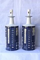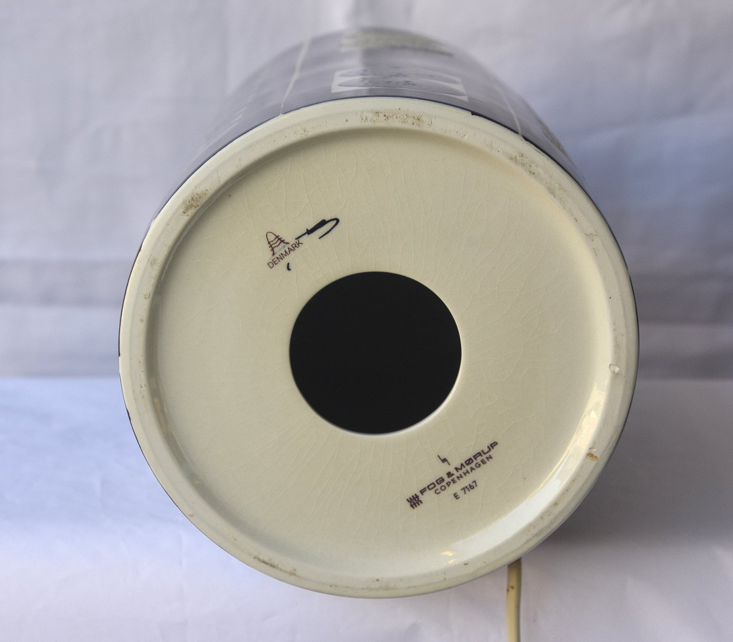 Aluminia Bordlampe E 7167, lavet for Fog & Mørup. Lampefoden er lavet af kunstfajance og blå med geometrisk mønster. Design Ingelise Kofoed for Fog & Mørup.