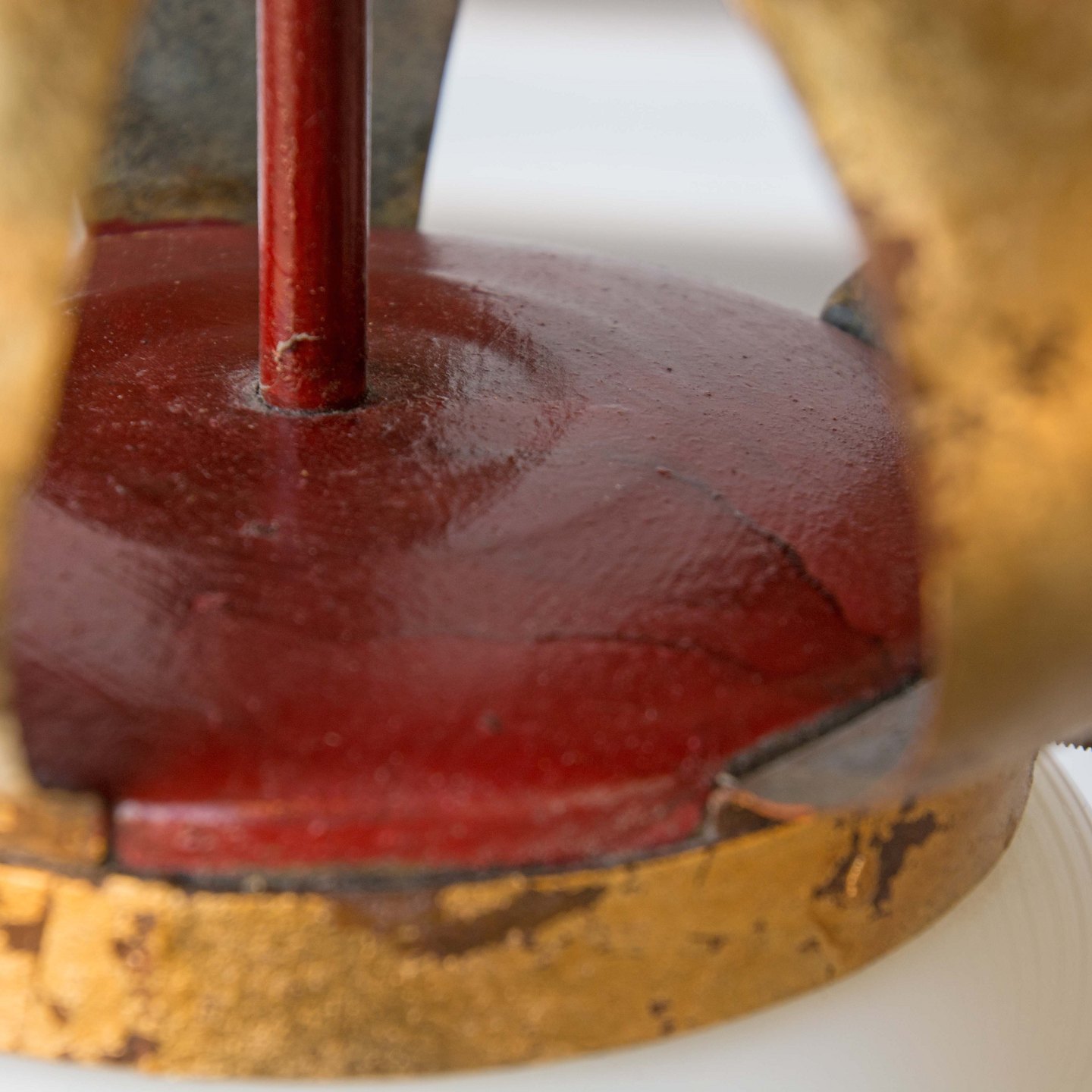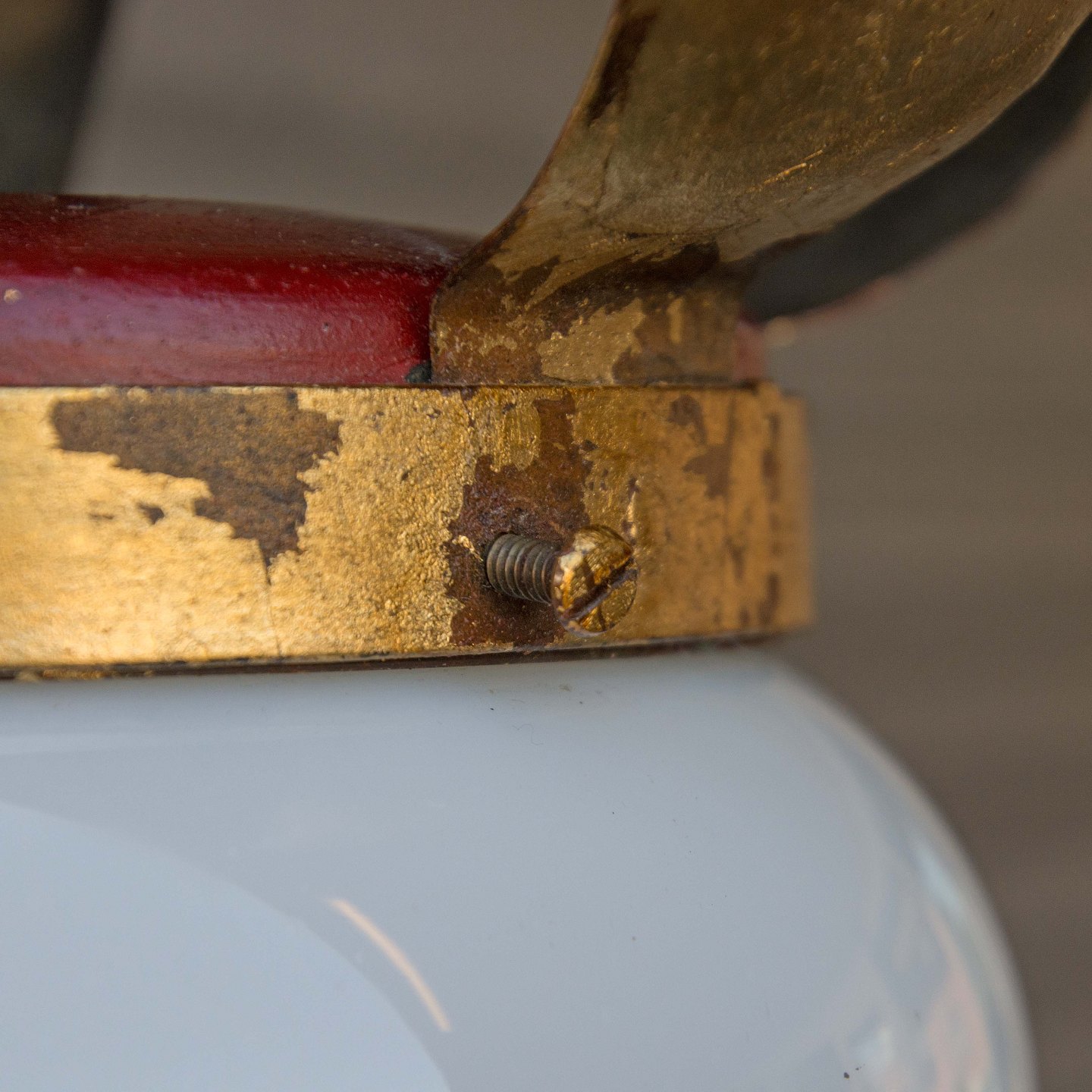 Lampen er i metal belagt med gylden og rød maling samt hvid glasskærm.