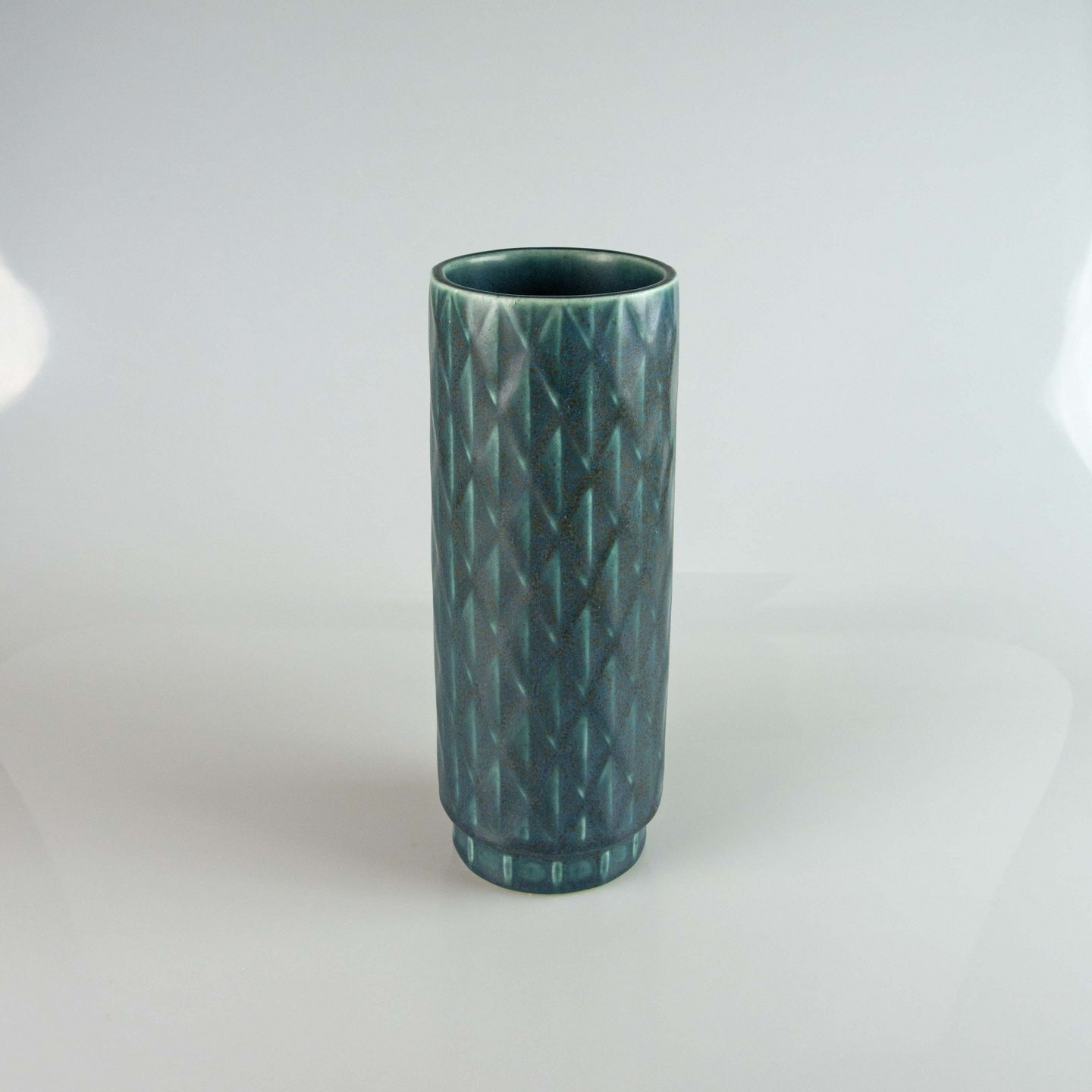 Cylinderformet vase i blågrøn stentøj med abstrakt mønster