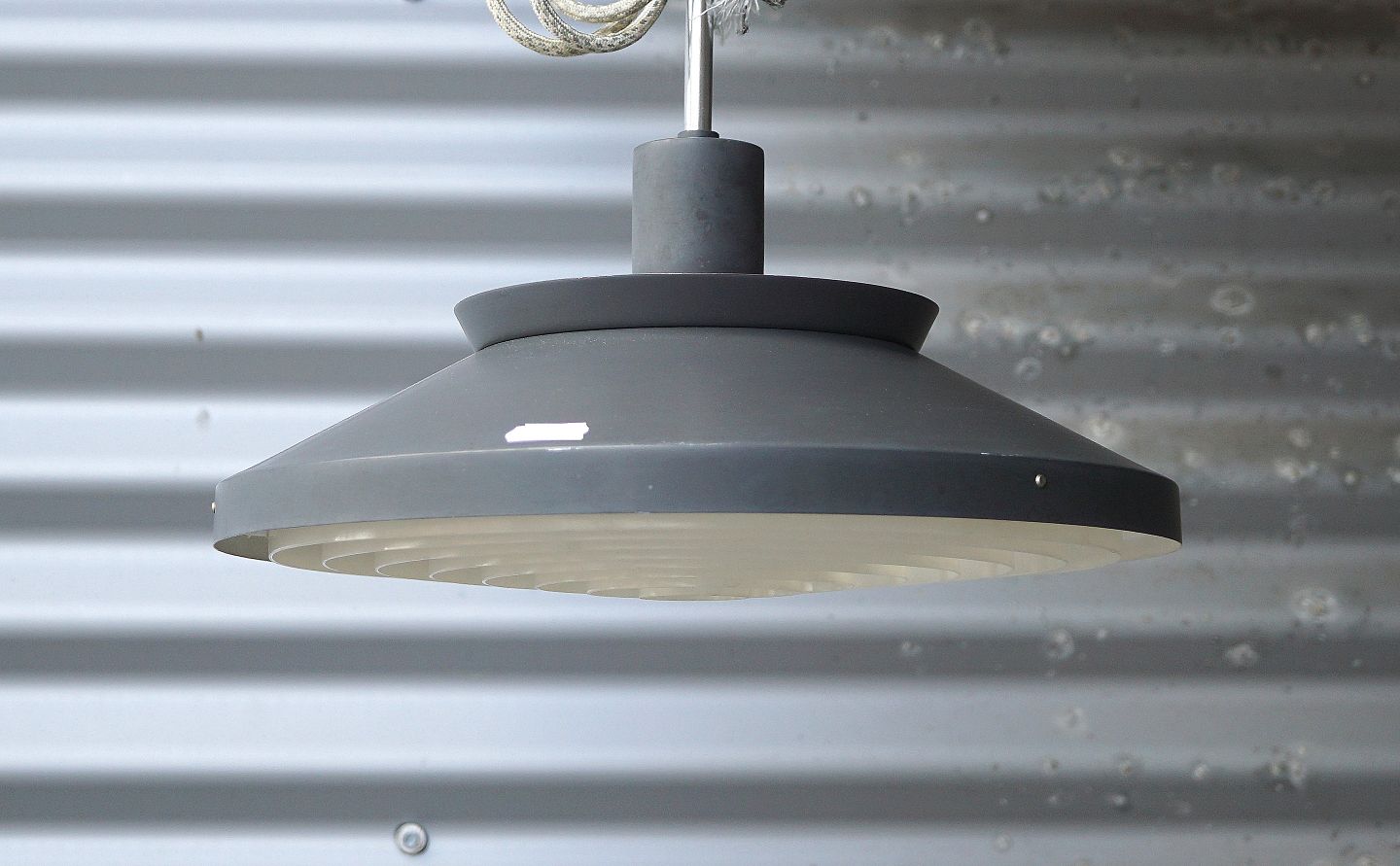 Mat sort metal pendel. Pendlen har hvide, plast ribber, pendlen er monteret med stofledning.