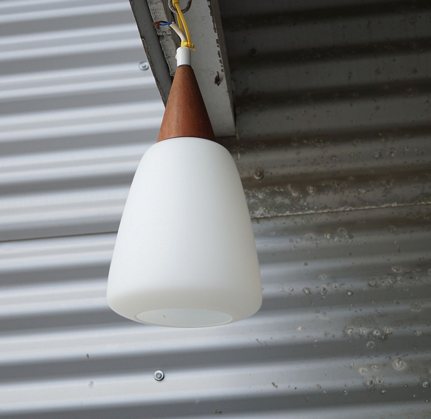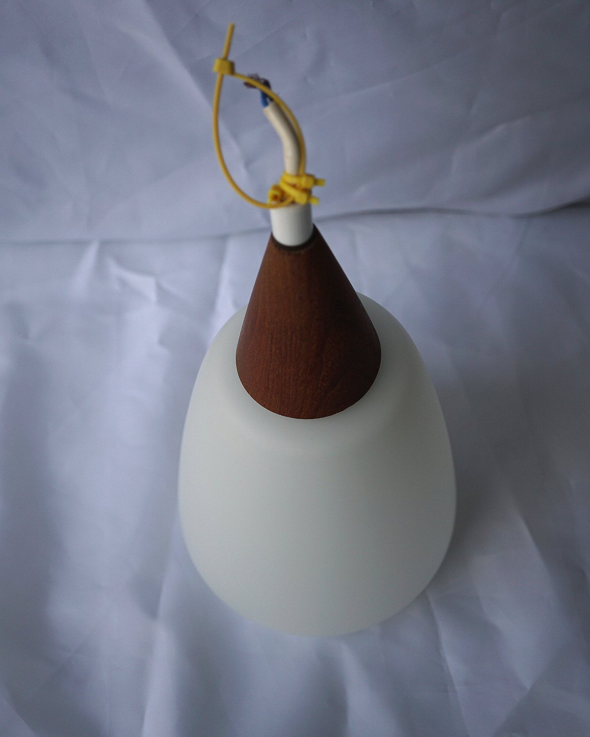 Pendel med skærm i opalglas. Topstykket er af teaktræ