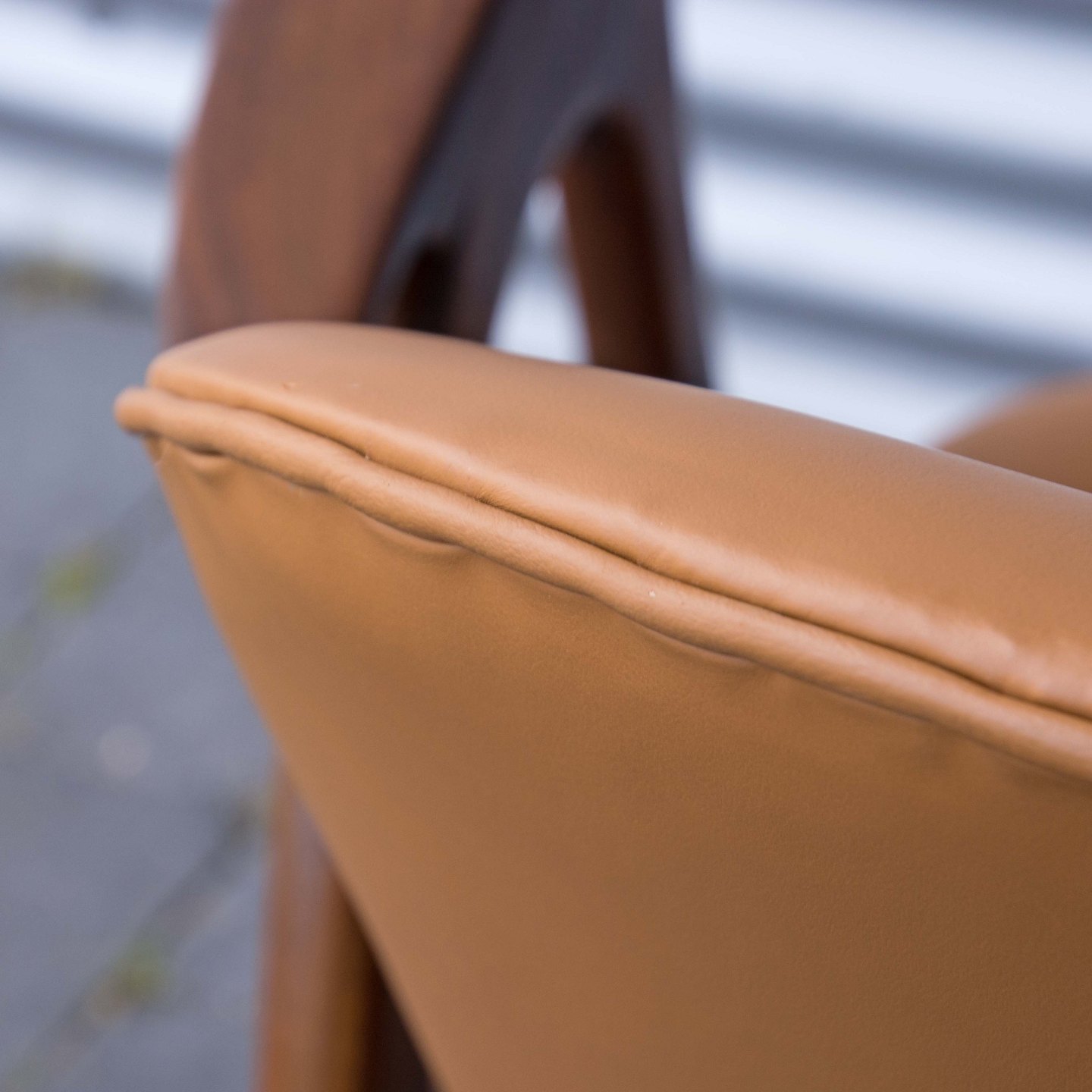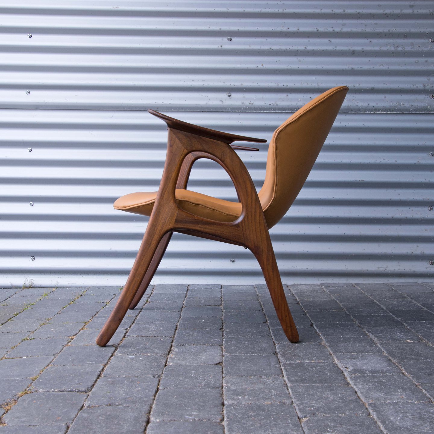 Lænestol i teaktræ med hjemmepolstret sæde i lyst nappa, der er hjemmepolstret.