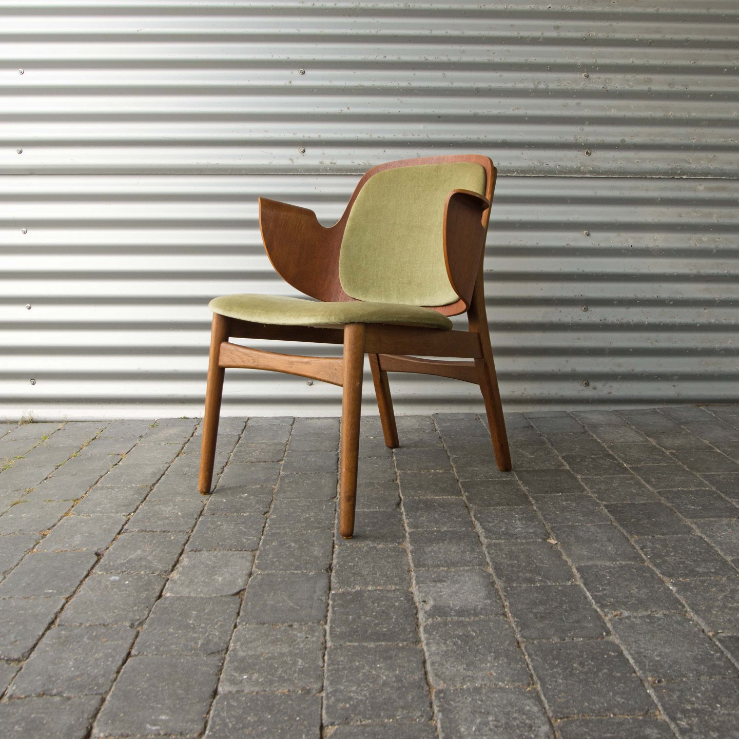 Et sæt armstole i teaktræ betrukket med flaskegrønt velour