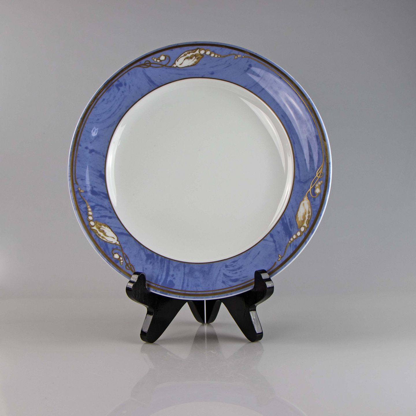 Tallerken med lyseblå marmoret bort dekoreret med gylden blomsterknop.