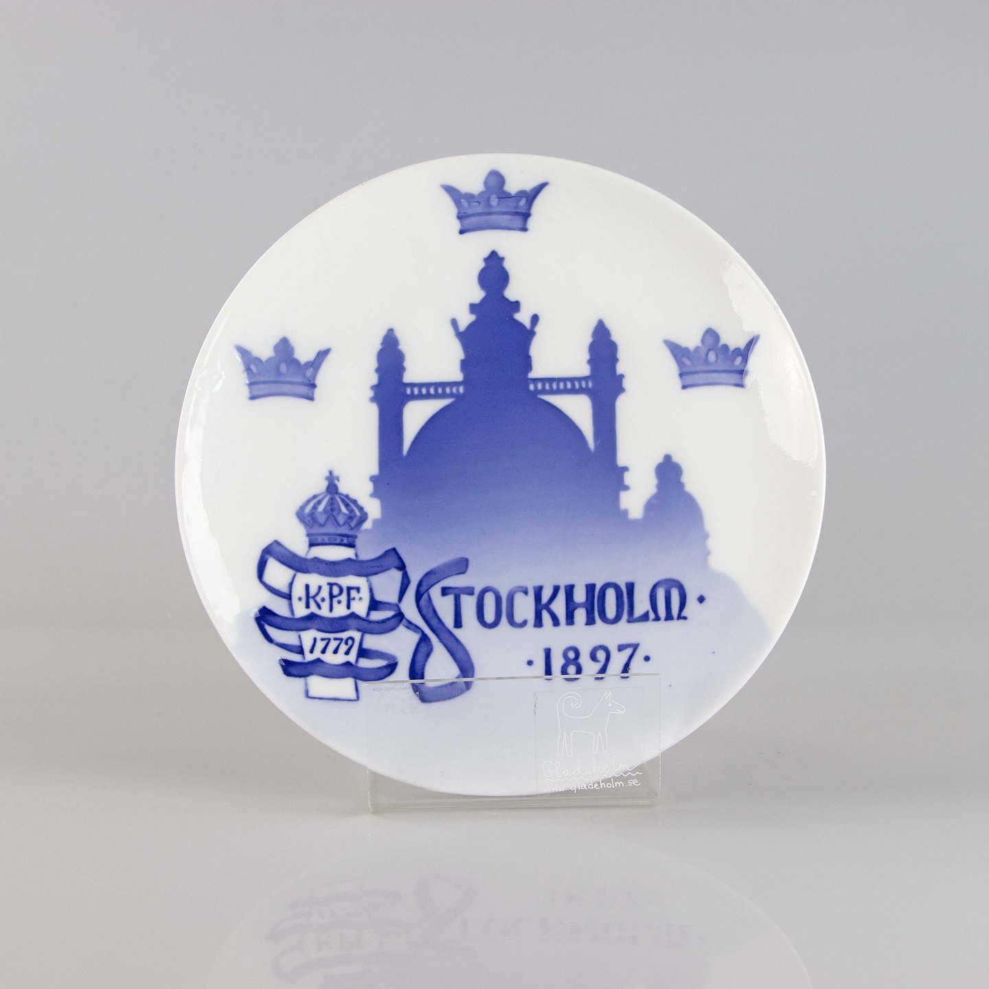 Platten er fremstillet for Kunst- og industriudstillingen i Stockholm og har motiv af kuppel og tre kroner