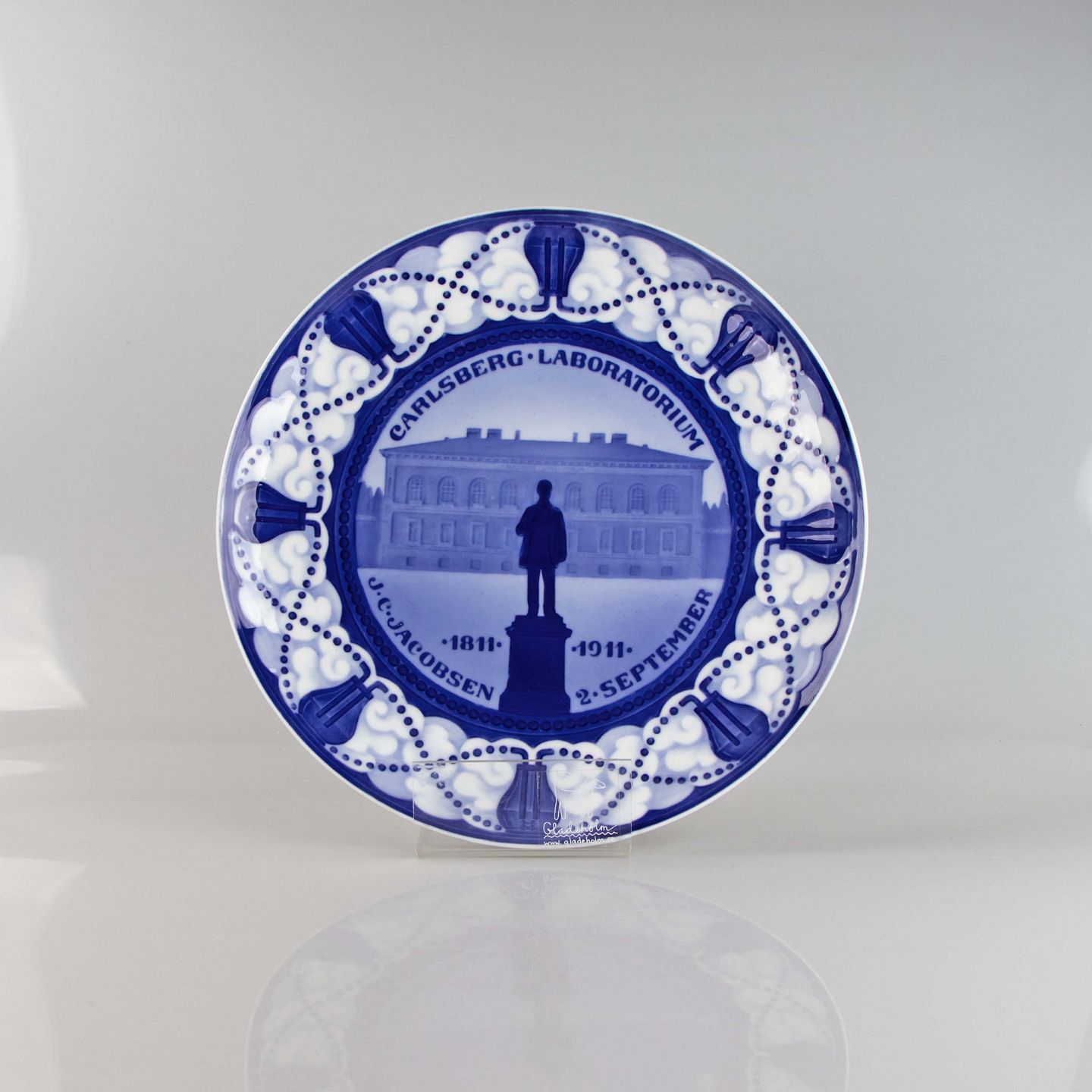 Mindeplatte i porcelæn med teksten Carlsberg Laboratorium år 1811-1911. J.C. Jacobsen 2. september nr. 1274