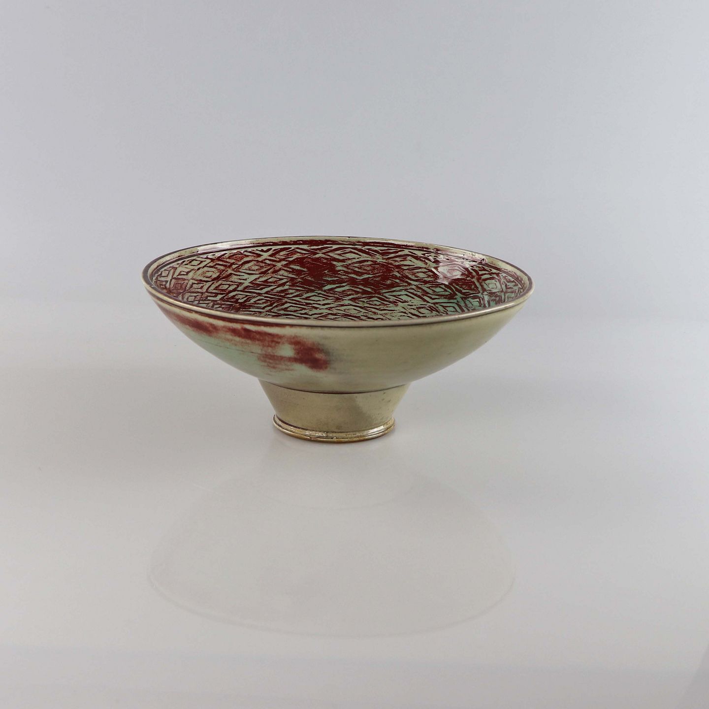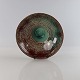 Skål i keramik med mønstret glasur i røde og blågrønne nuancer