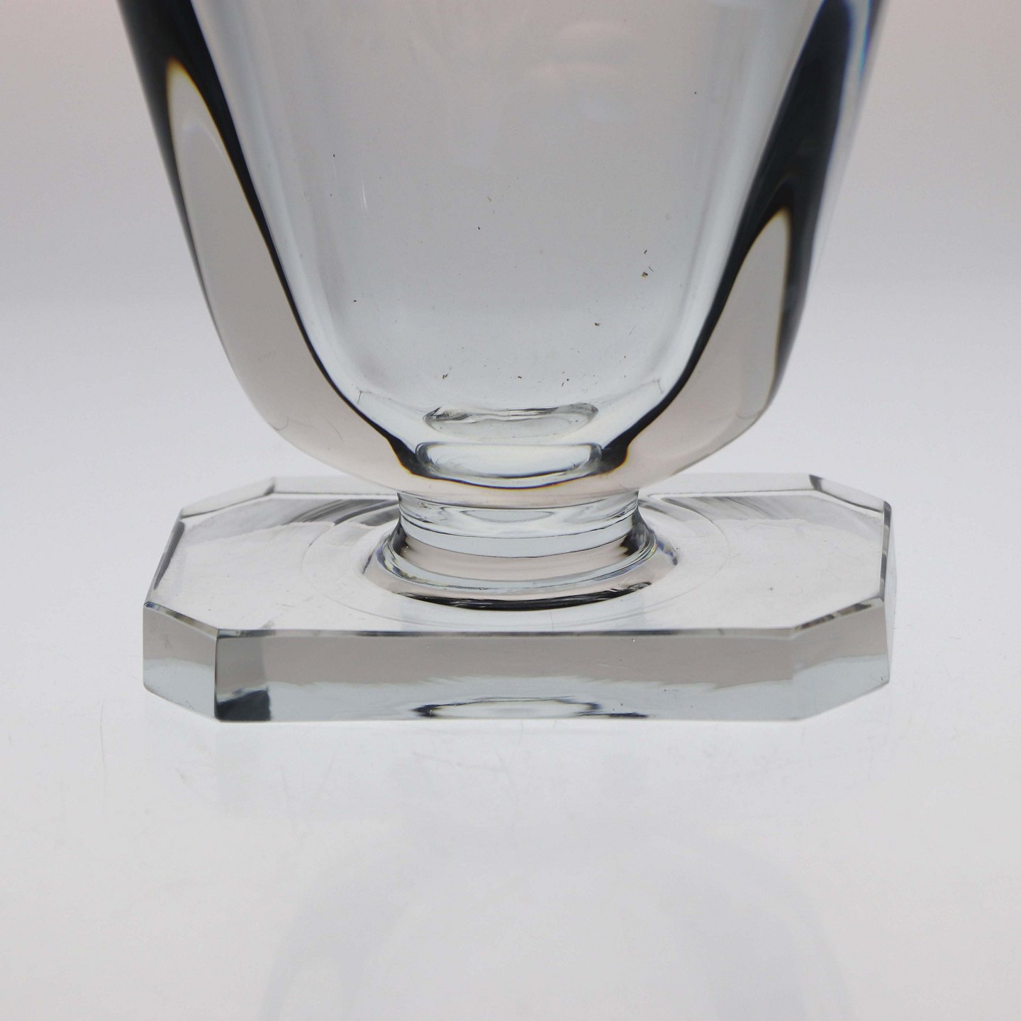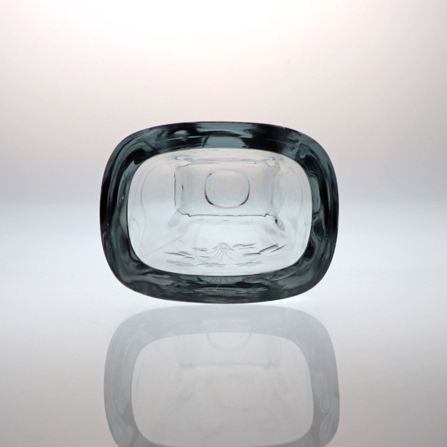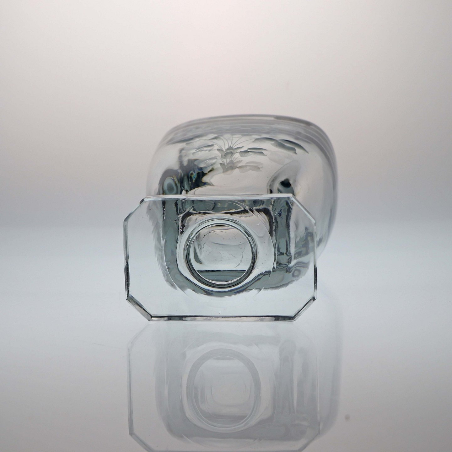 Vase i blålig glas på fod med motiv af blomsterbuket, hånd indgraveret