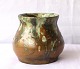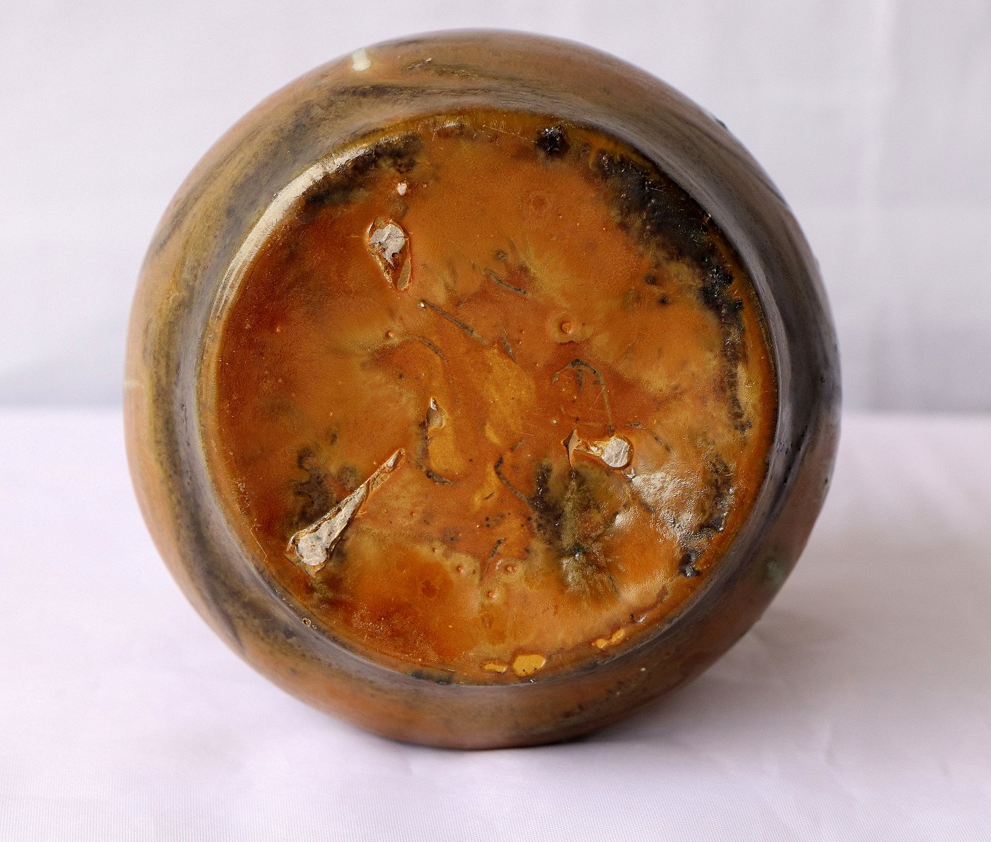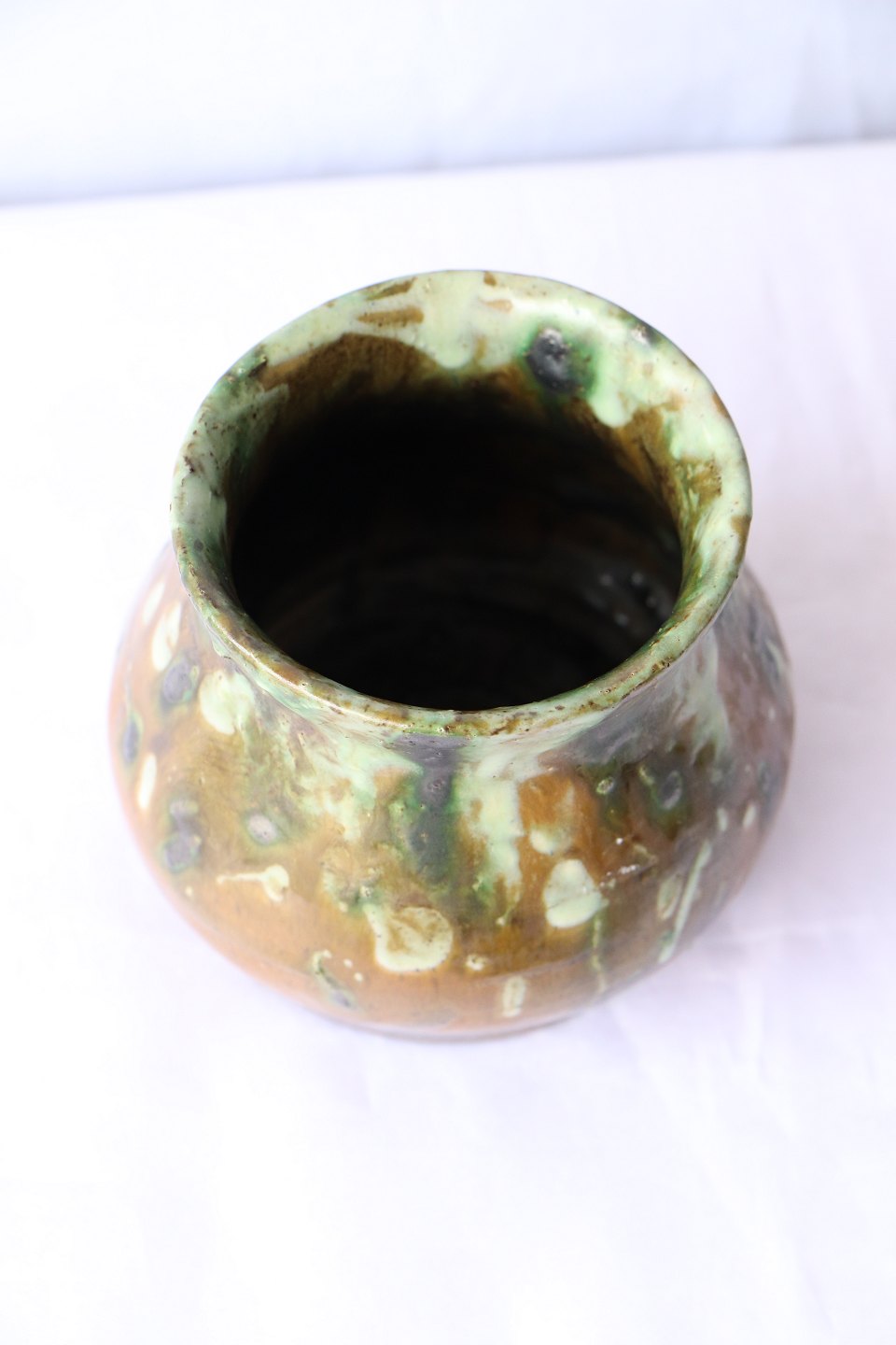 Keramik krukke med brunligt glasur, der er grønlige stænk på krukken