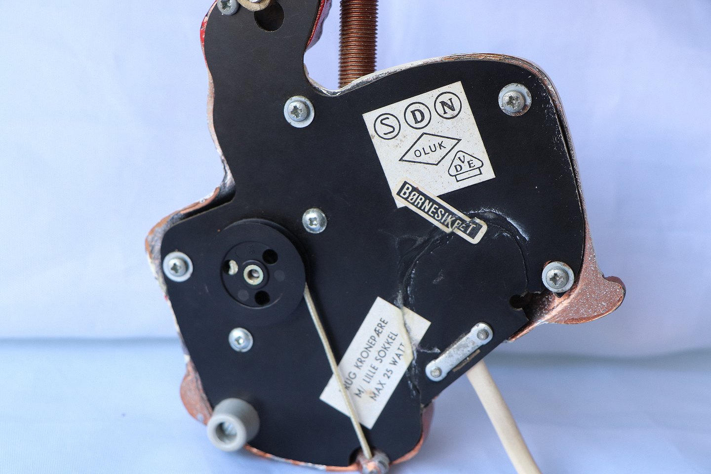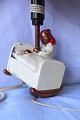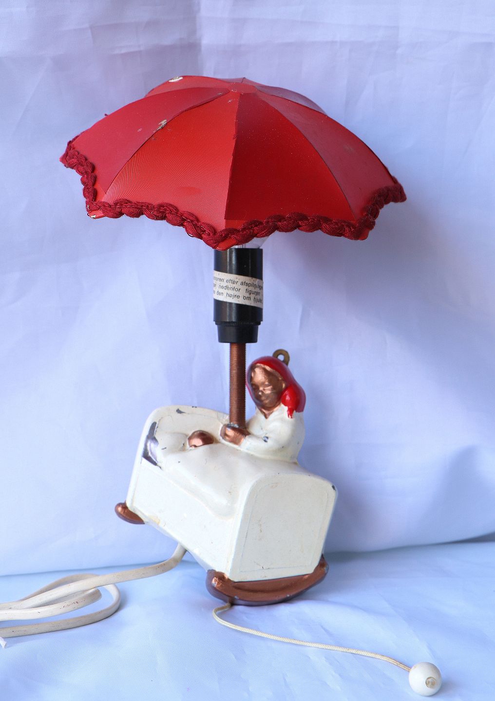 Ole Lukøje væglampe, med spilledåse. til spilledåse er der snoretræk. Lampen er cremefarvet med rød plast skærm.