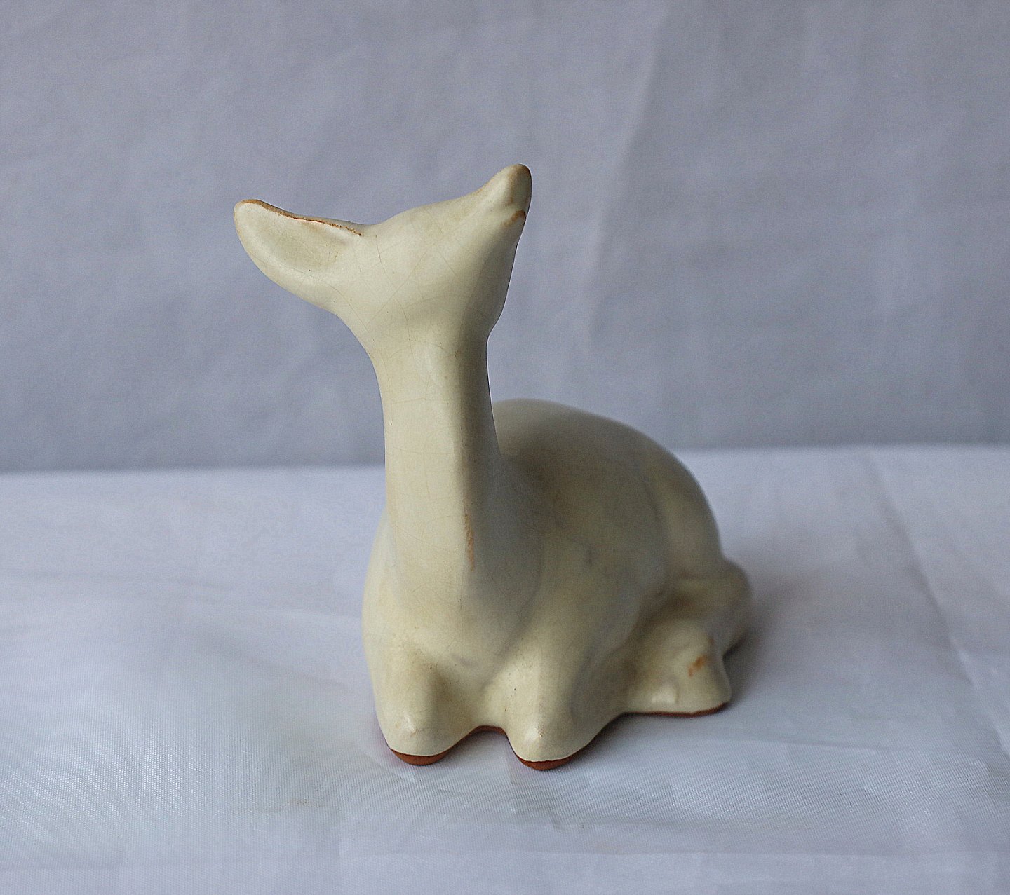 Liggende dådyr. Dådyret er lavet af keramik og glaseret cremefarvet