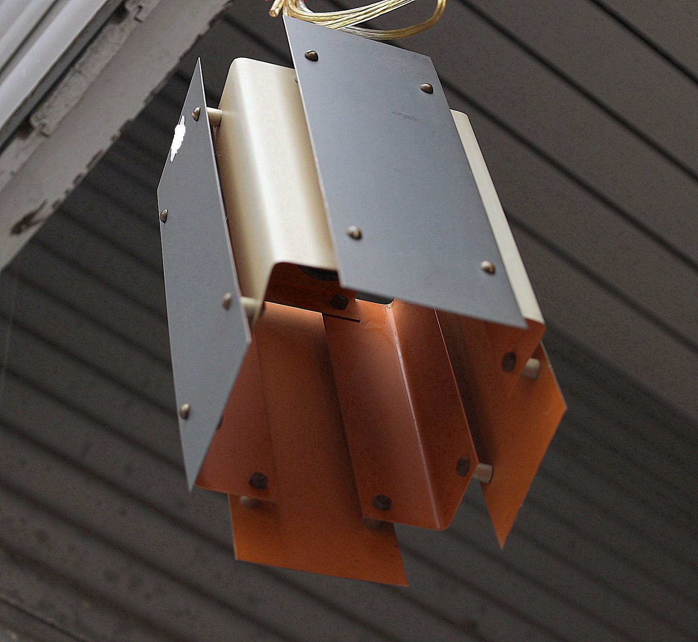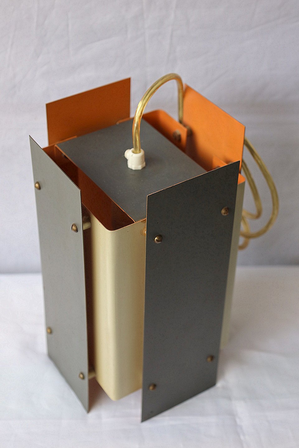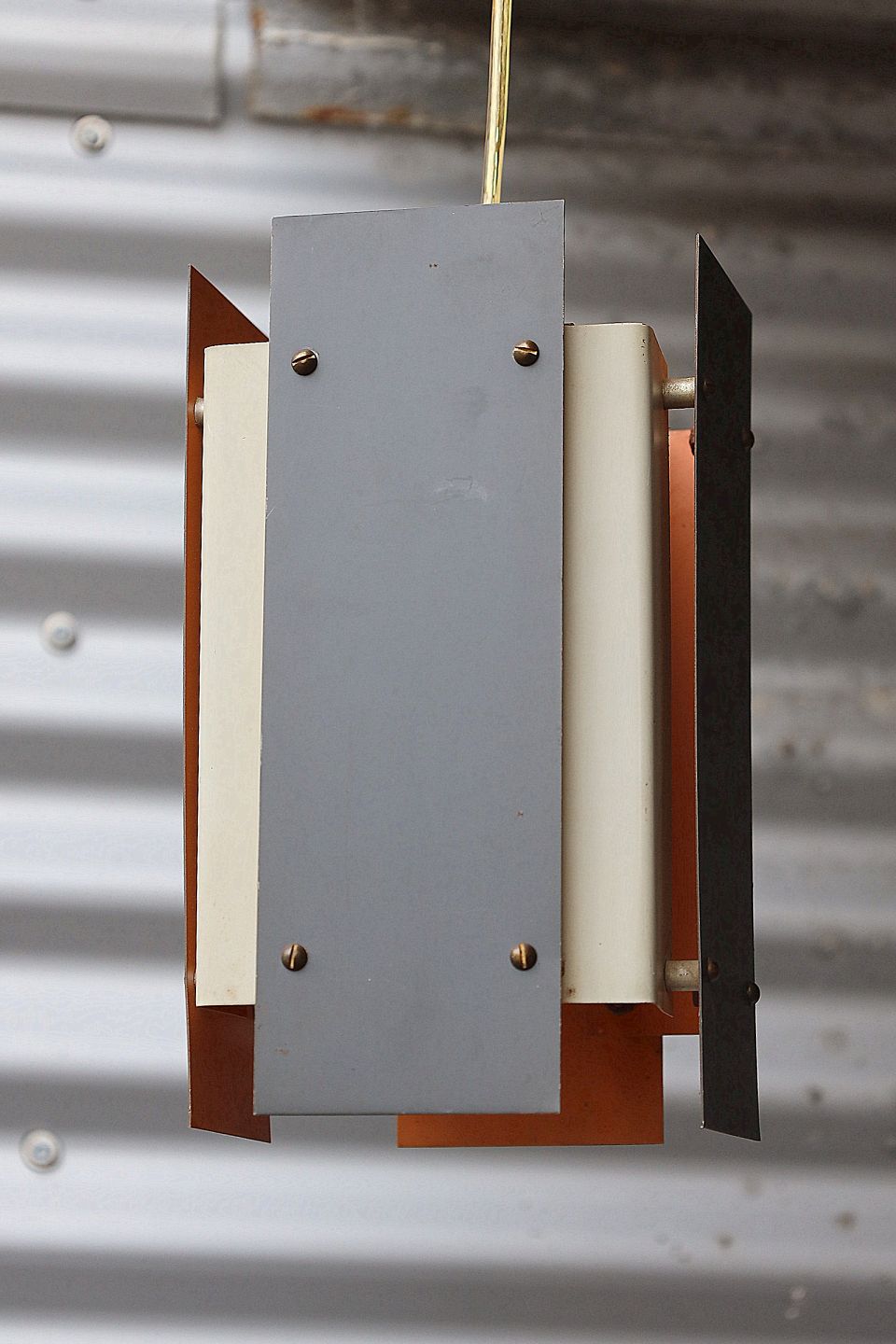 Metal loftslampe, lampen er lakeret grå/sort udvendig og indvendig orange