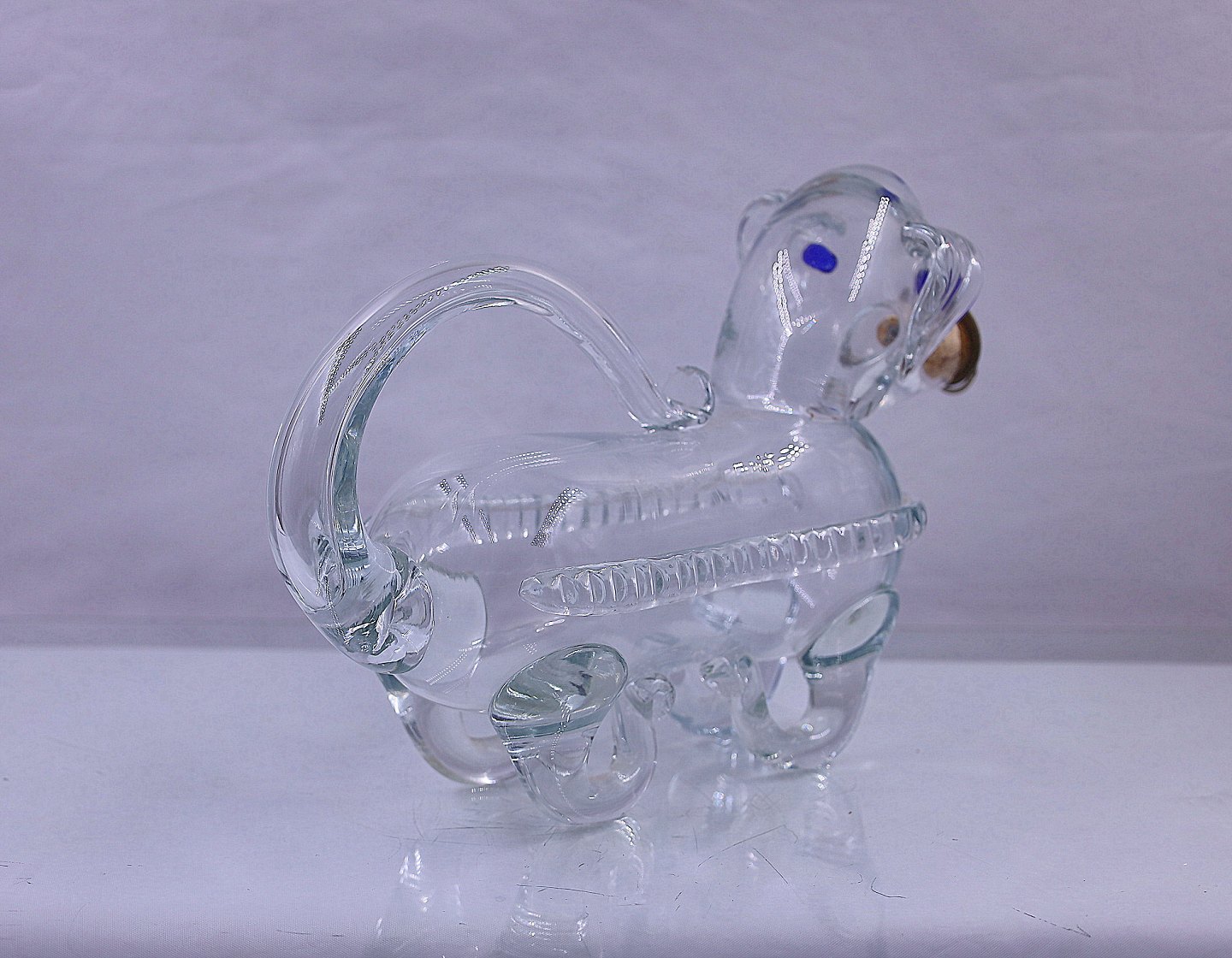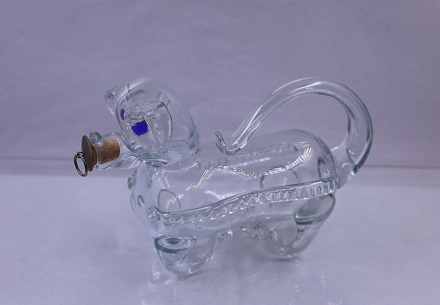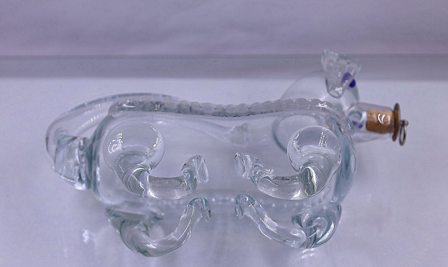 Holmegaard. Snapsehund med blå øjne og korkprop. Påsatte ører og ben. Halen, der også er påsat , fungerer som håndtag.