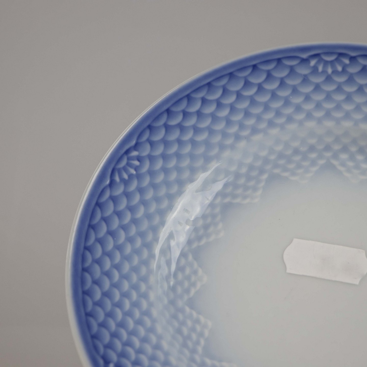 Tallerken fremstillet i hotelporcelæn med skelform i gradueret blå nuancer.