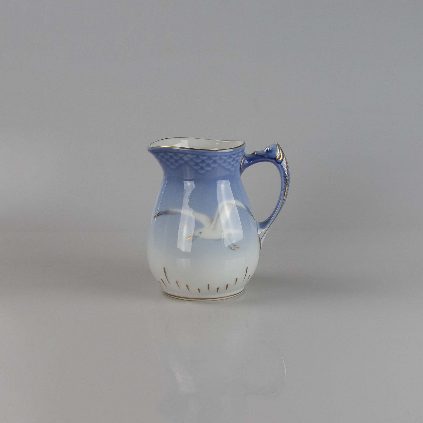 Kande fremstillet i porcelæn med skelform i gradueret blå nuancer med guldkant samt motiv af måge.