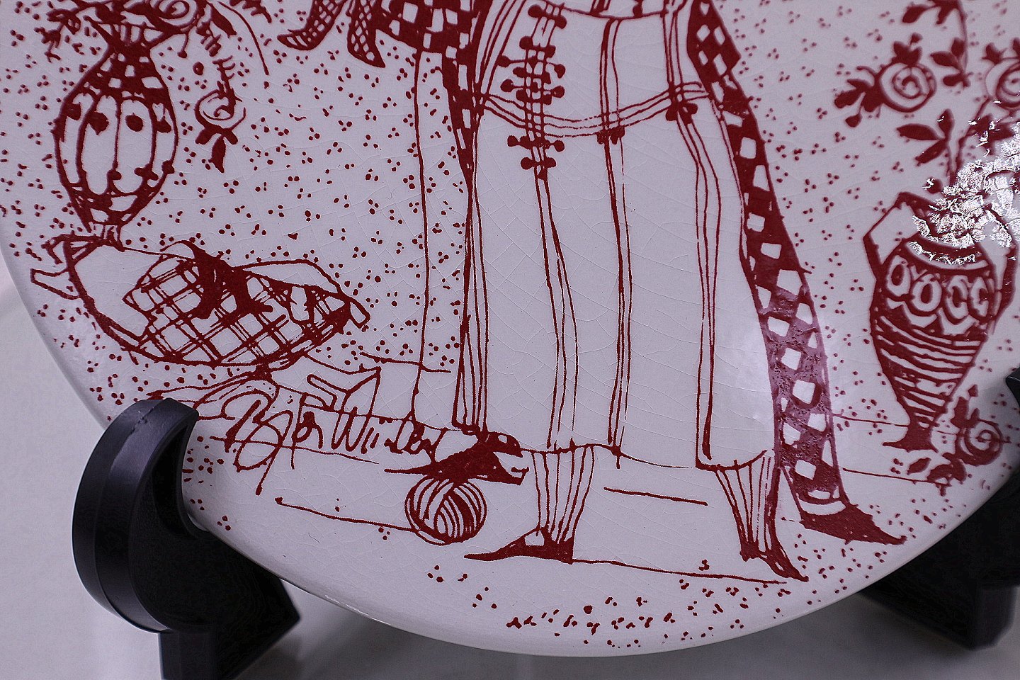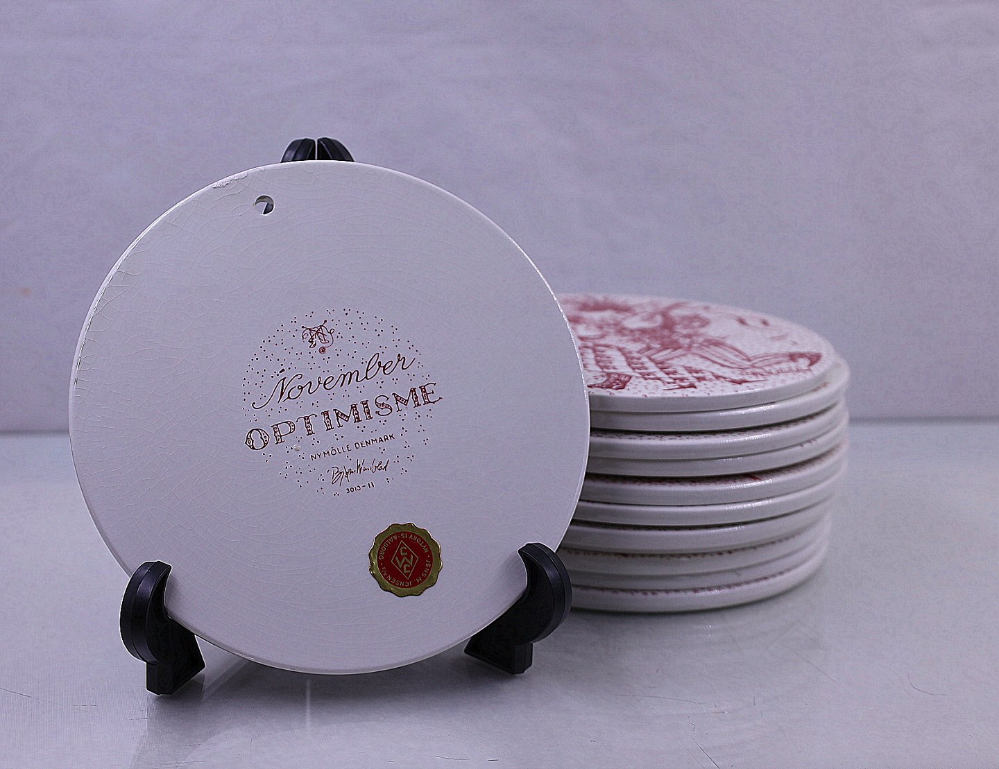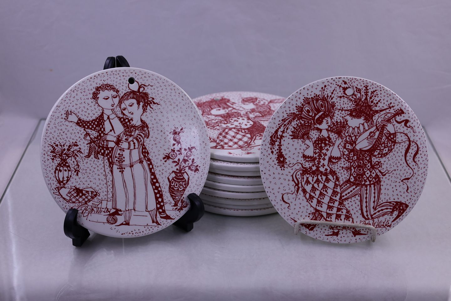 Bjørn Wiinblad. Månedsplatter/brikker med rød dekor. Platterne viser "Året for et kærrestepar", det viser fra de mødes i januar til der kommer barn i december.