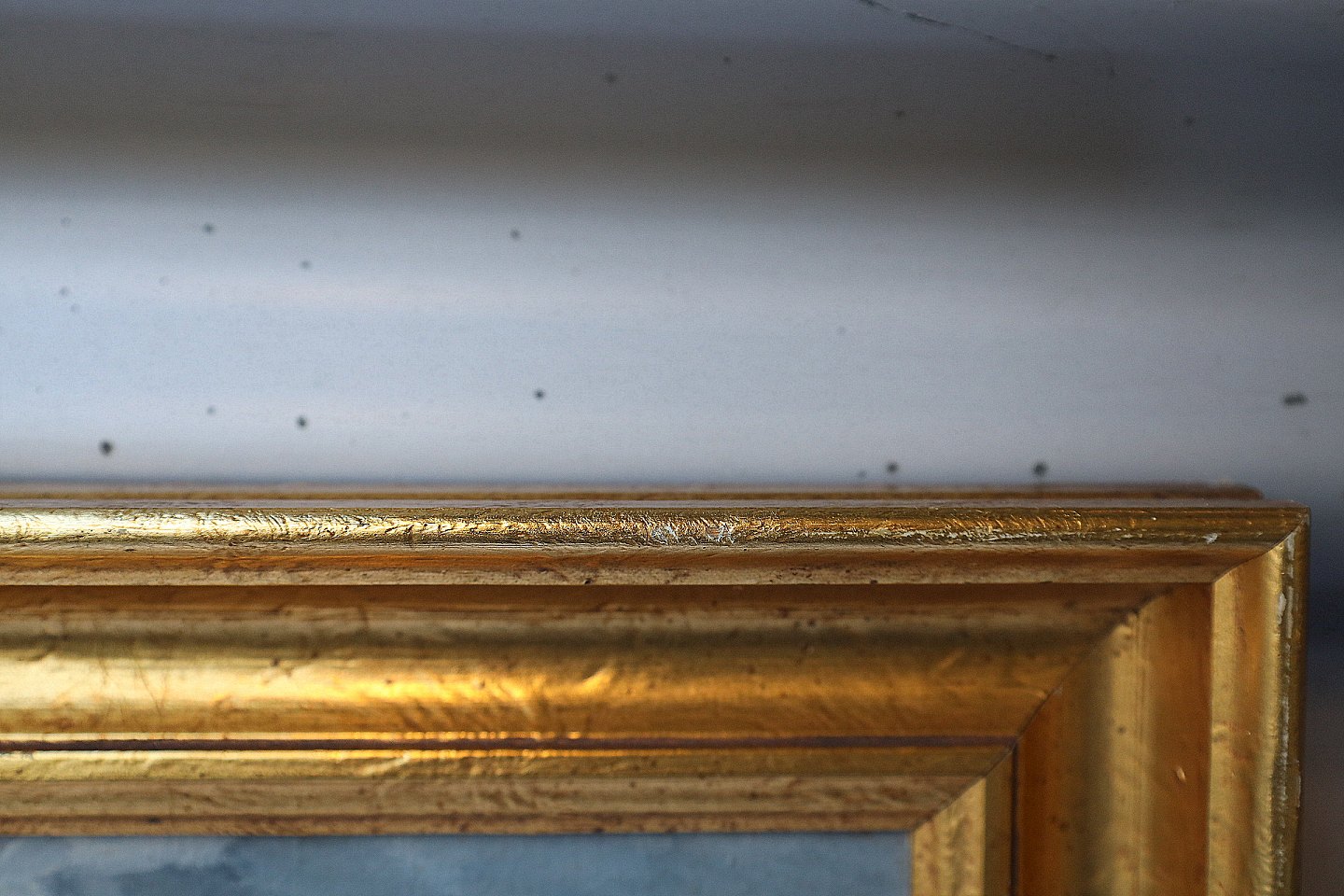 Maleri med strand og sejlbåde. Maleriet er i guldramme med få brugsspor.