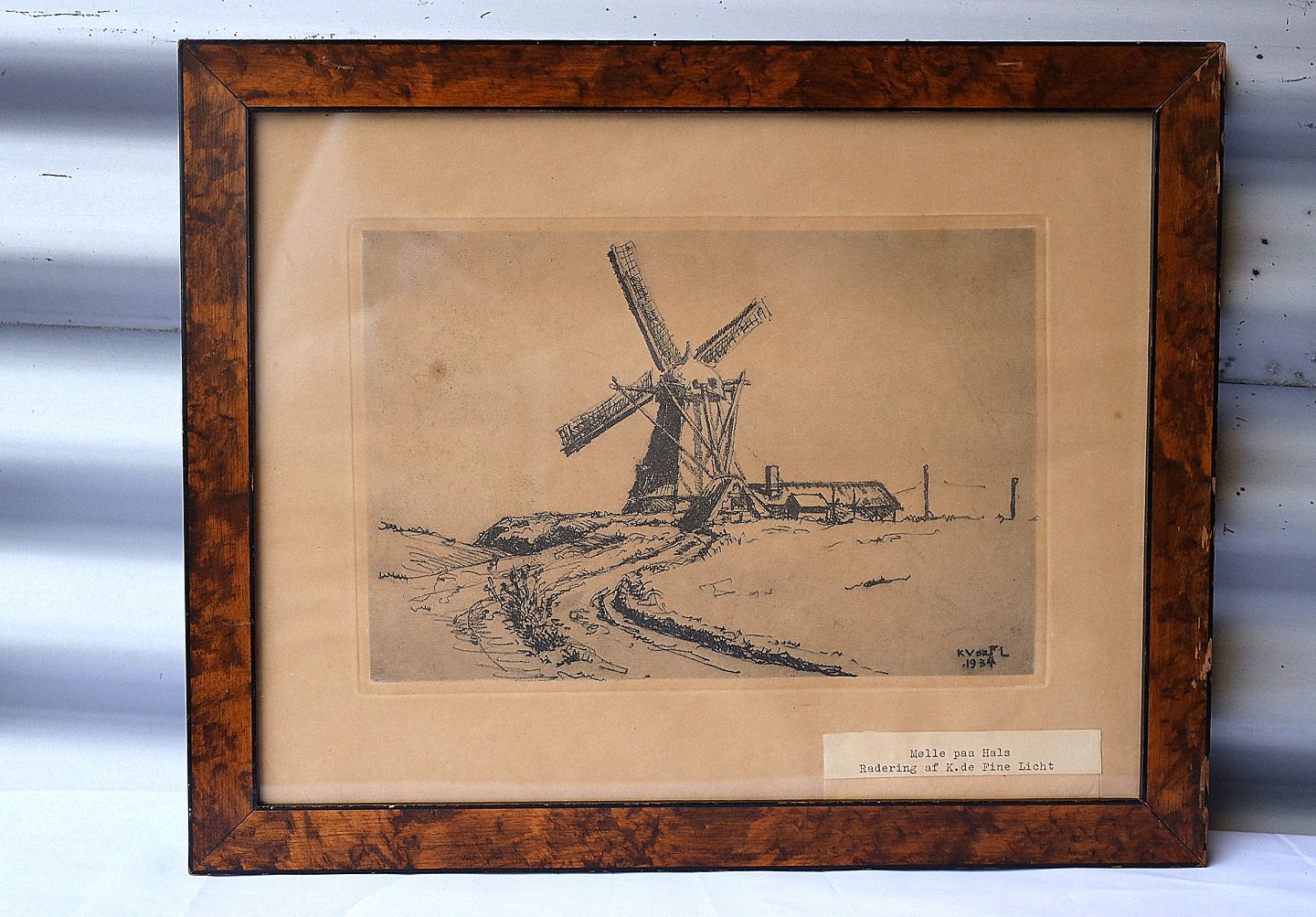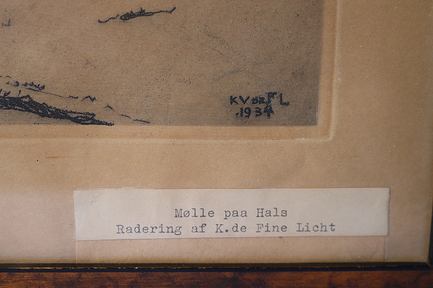 Radering K. de Fine Licht. Raderingen forestiller "Mølle i Hals". Der er enkelte brugsspor på rammen
