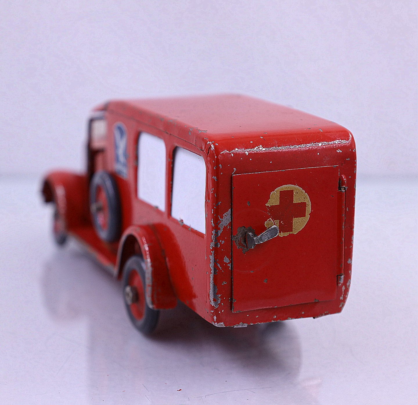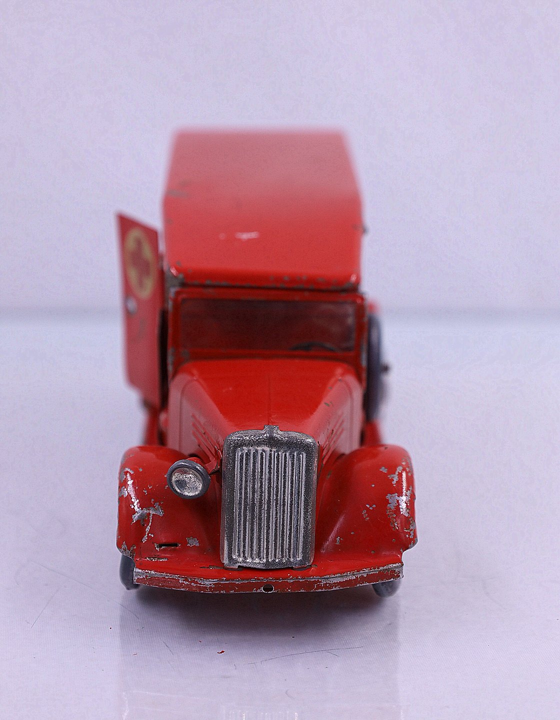 Falks Redningskorps. Ambulance fra Tekno, lavet af blik. Ambulancen har en båre og bagruderne er matteret. Der er en sidedør og bagdøren der kan åbnes. Der er brugsspor på ambulancen
