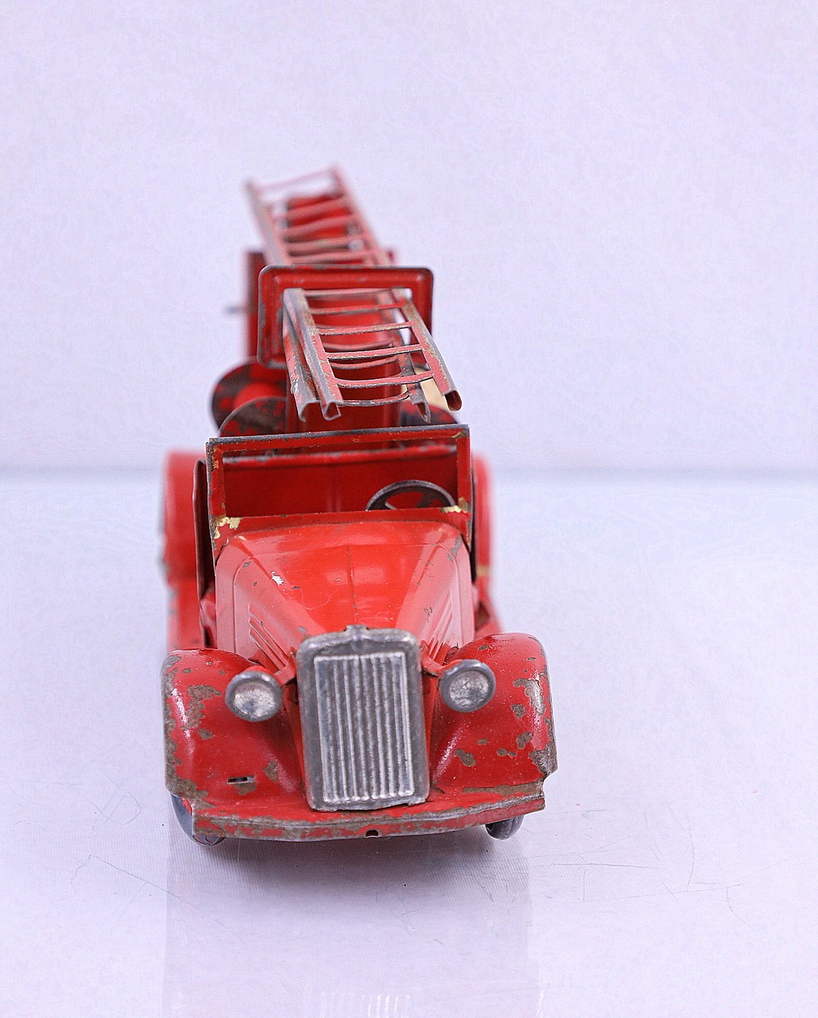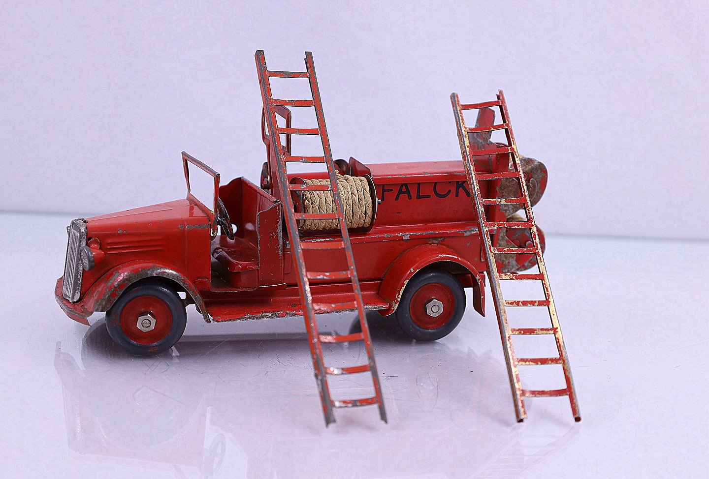 Falck Stige vogn. Stige vogn med aftagelige stiger. Tekno, Made in Denmark, bilen er lavet af blik. Der er brugsspor på bilen