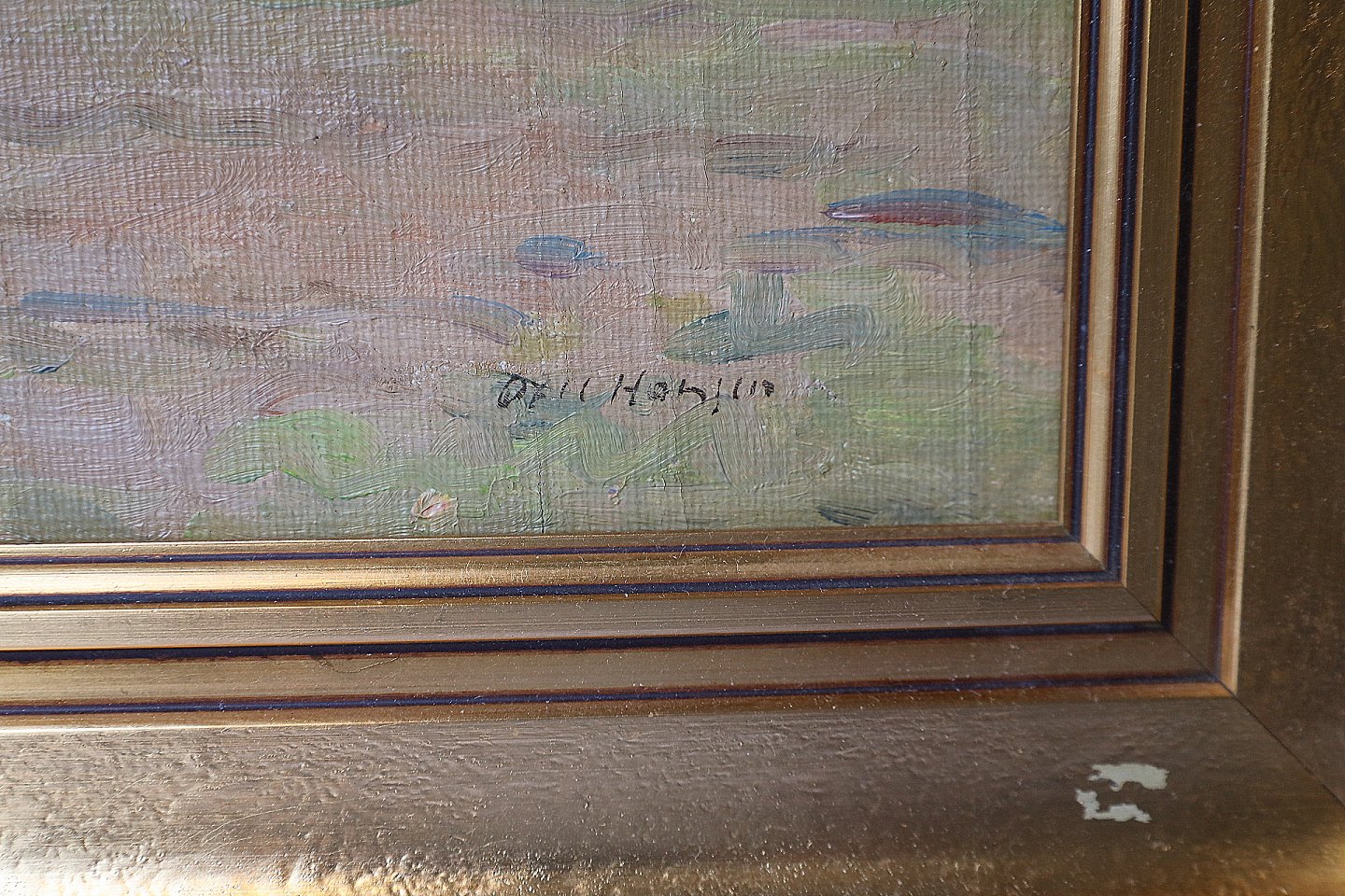 Maleri, Axel Hansen (1896-1936). Landmandskone, der tager sig af 3 køer. Der er nogle høns der går i en dynge hø. Maleriet er i guldramme, rammen har enkelte brugsspor.
