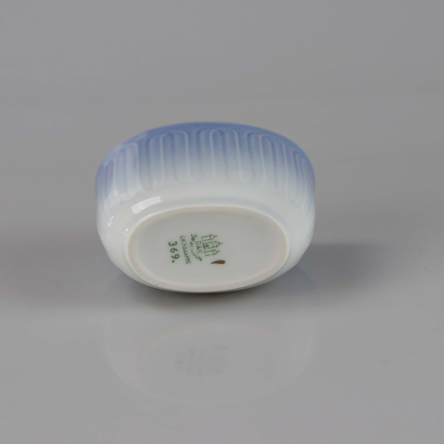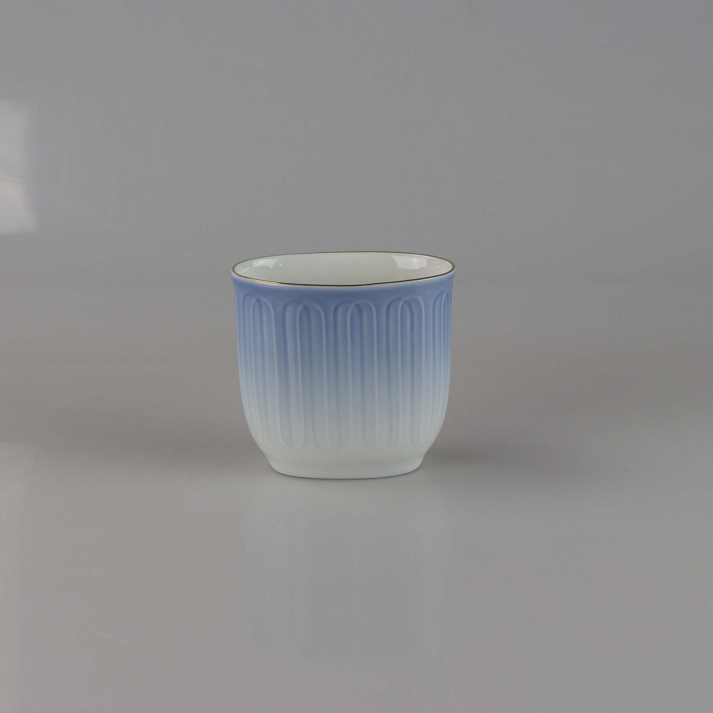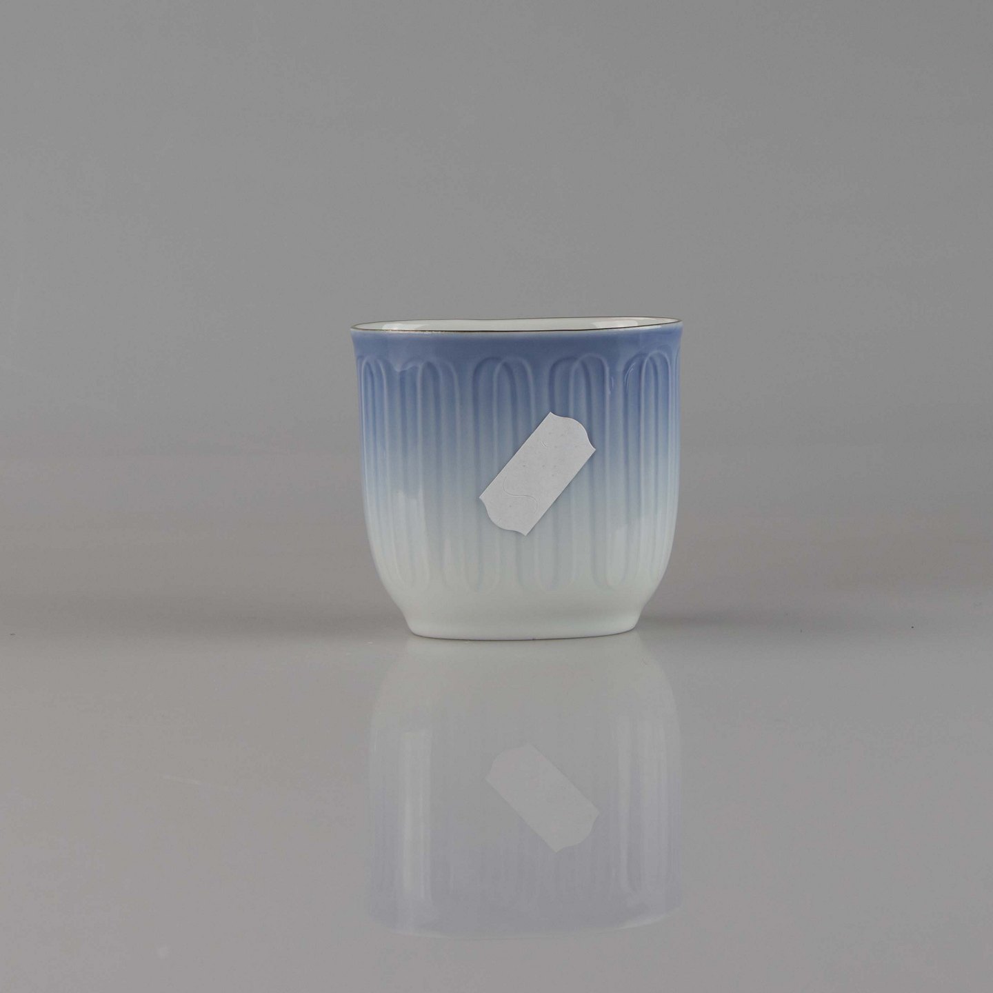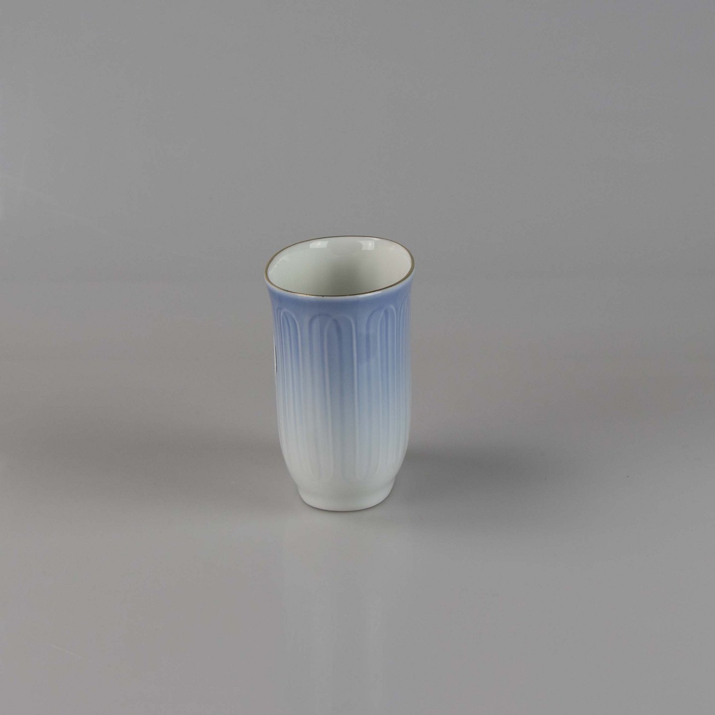 Bæger fremstillet i porcelæn med stribet motiv i gradueret blå nuancer.