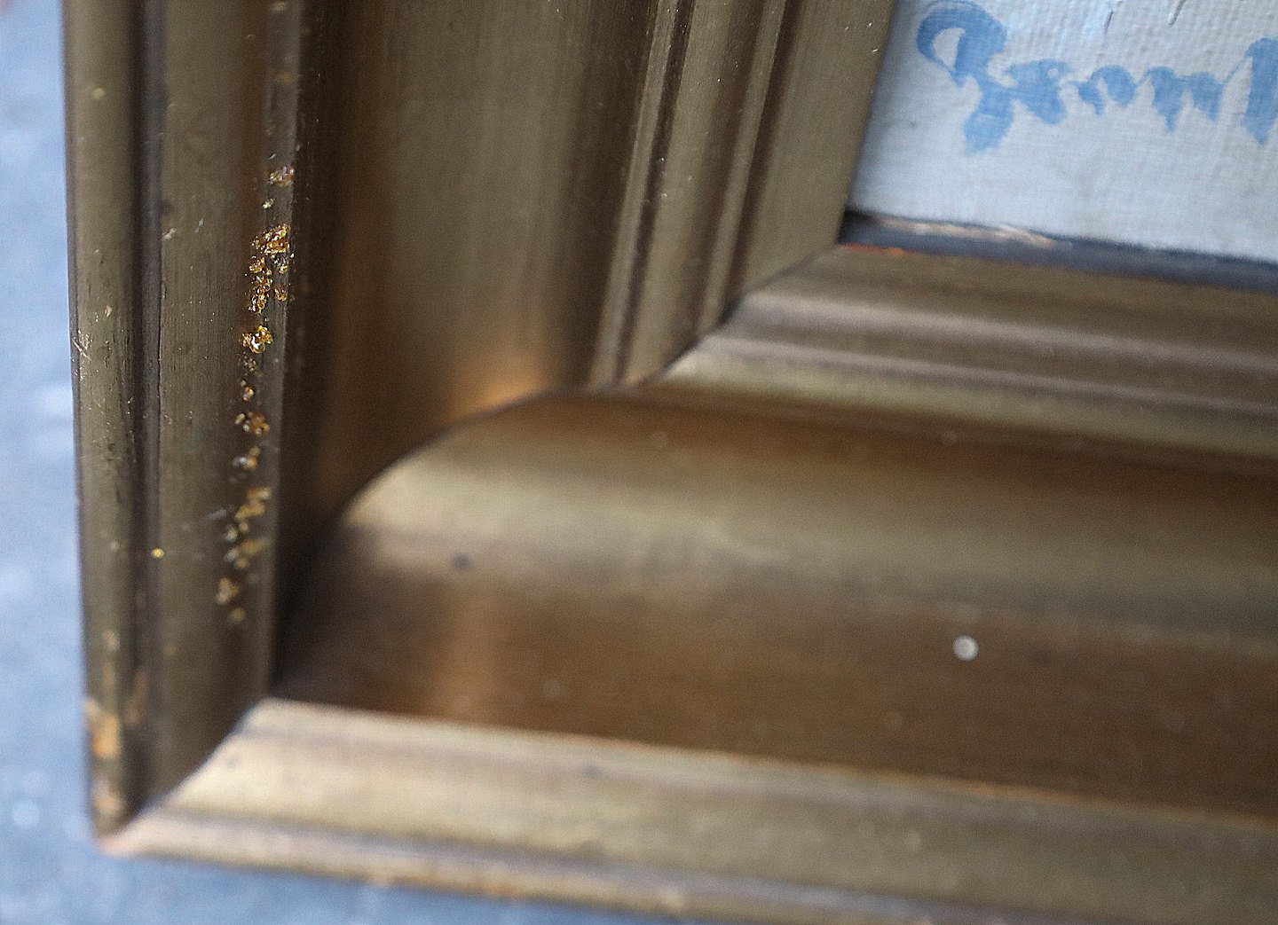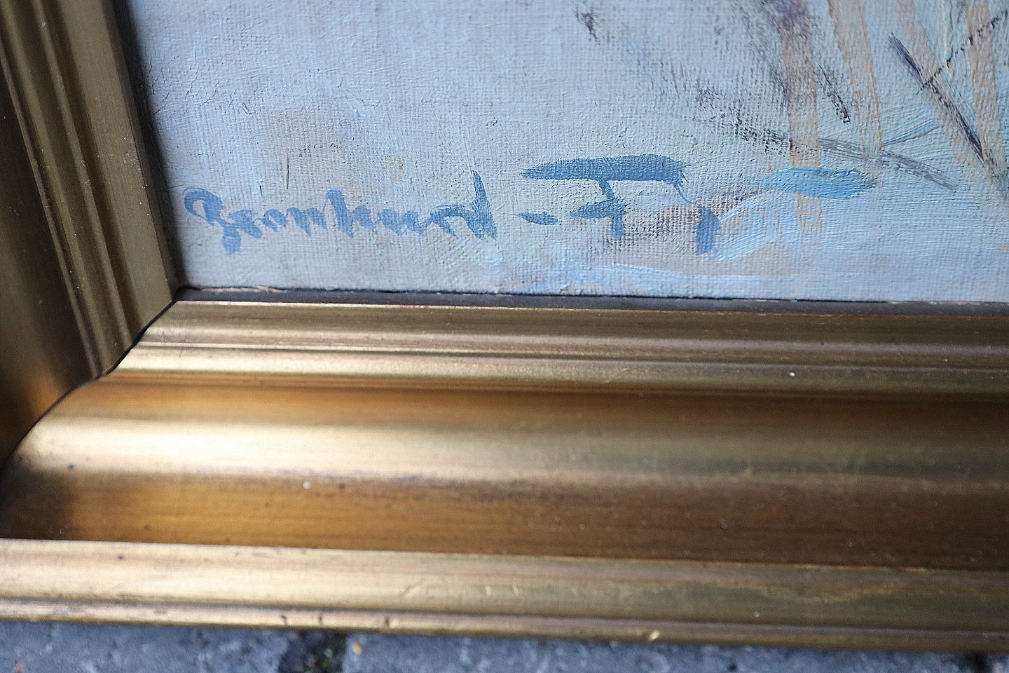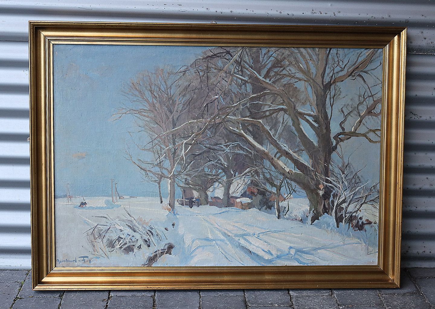 Maleri, Aage Bernhard Frederiksen (1883-1963). Vinterparti af skov, med hus. Signeret Bernhard F. Maleriet er i guldramme, rammen har brugsspor.