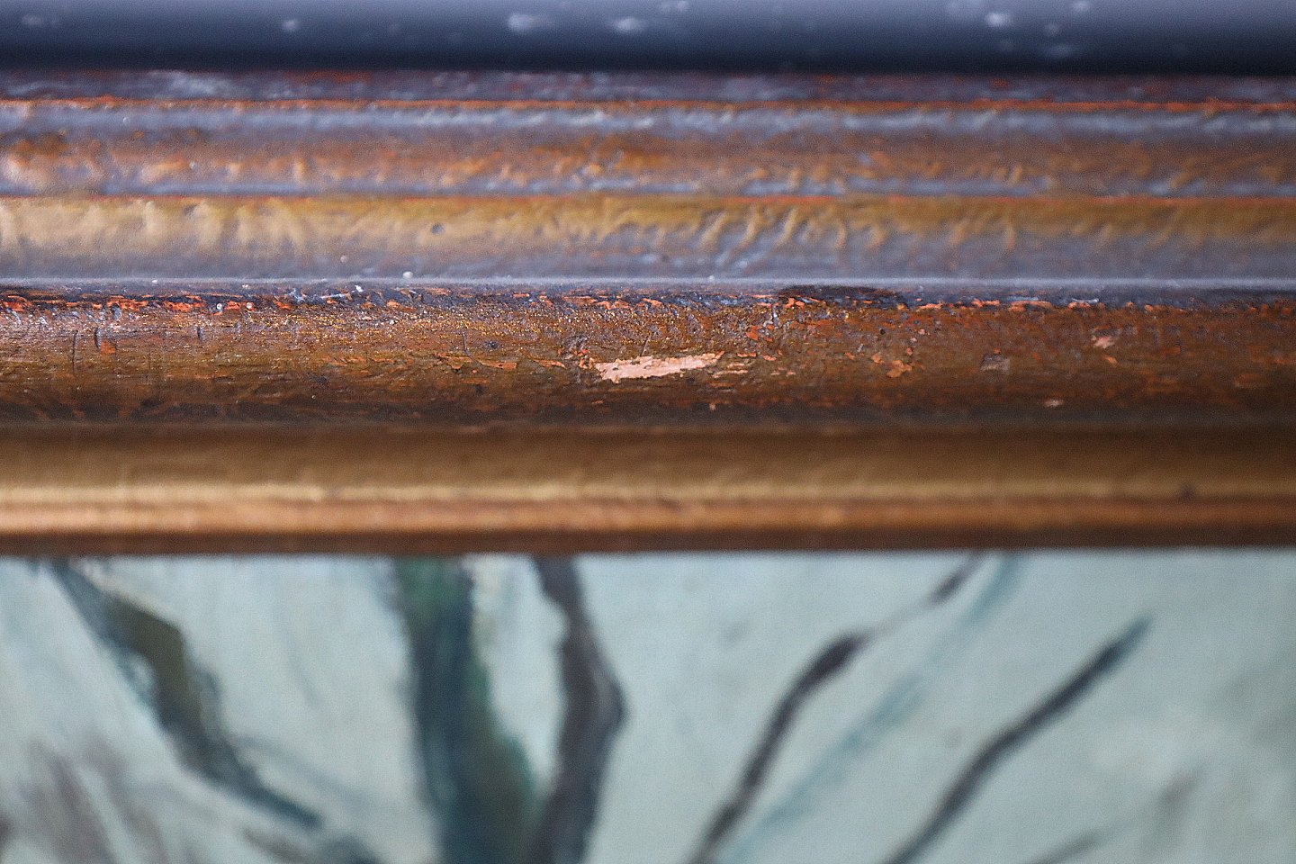 Maleri, Aage Bernhard Frederiksen (1883-1963). Parti af vej, i tøvejr, der ligger et rødt hus ved den ene side af vejen. Signeret B.F.. Maleriet er i en mørk guldramme, der har enkelte brugsspor