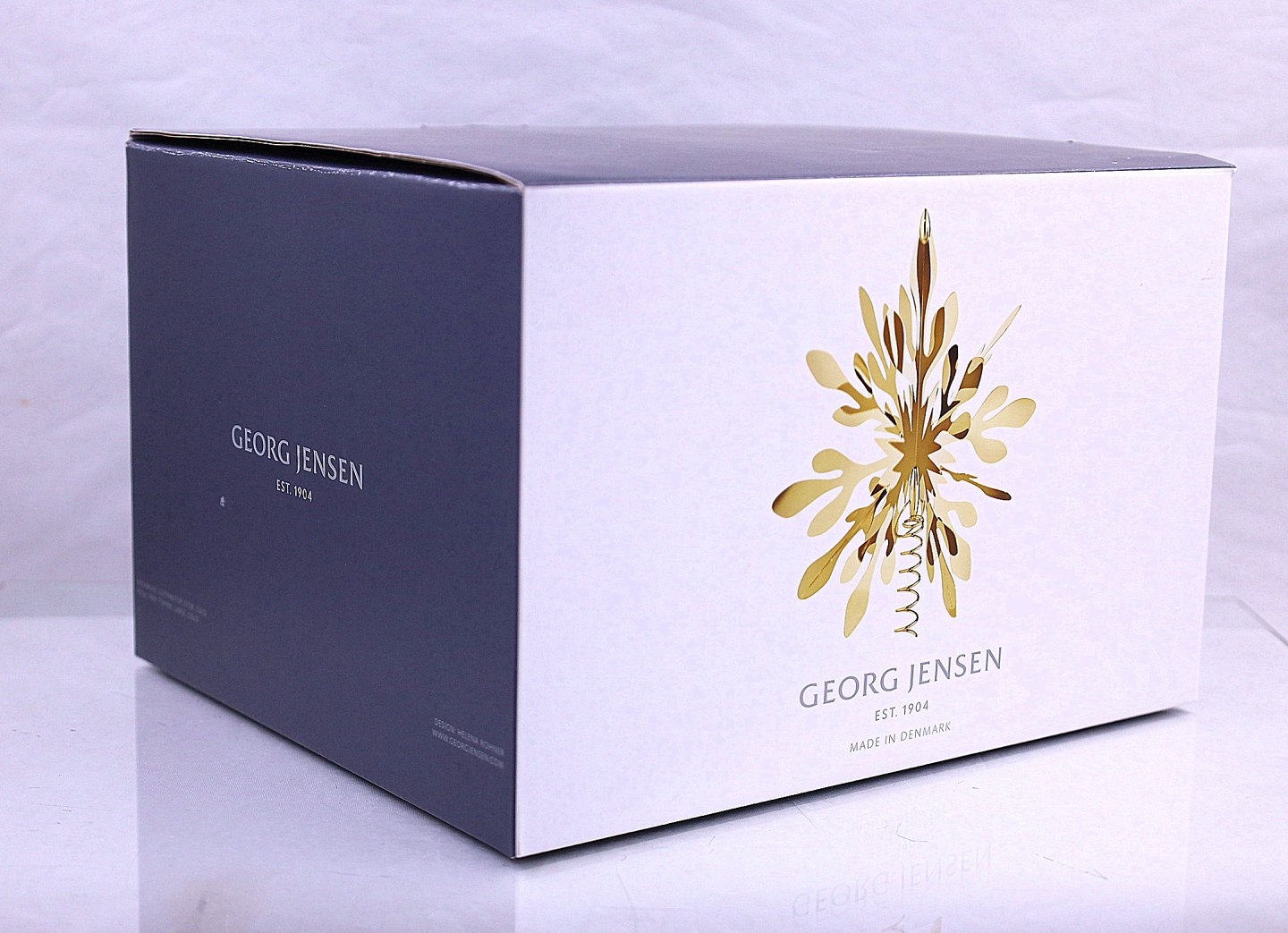 Georg Jensen. Kronblad topstjerne 2016, topstjernen kan både sættes på toppen af juletræet eller hænge. Kronblad topstjernen er stor størrelse. Topstjernen er messing belagt med 18 karat guld, og kommer i original æske, der er også et rødt ubrugt bånd med, der følger juletræs holder med.
