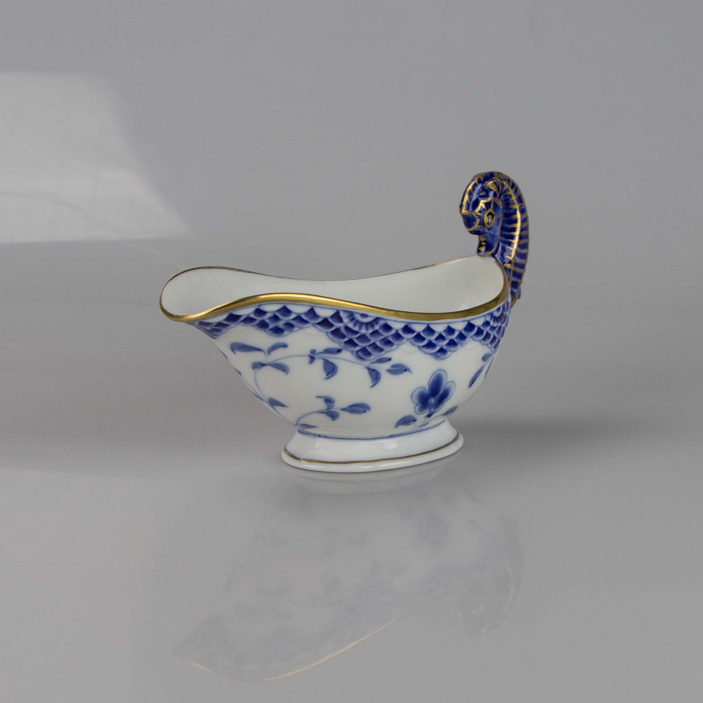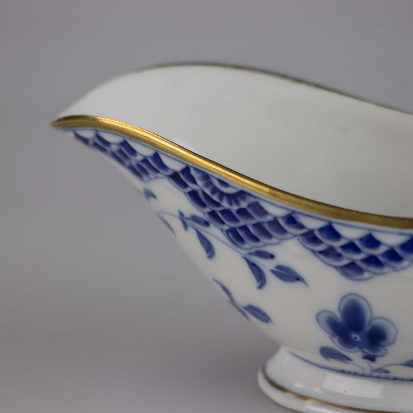 Smørnæb i hvidt porcelæn med guldkant med blå motiver af blomster og sommerfugle.