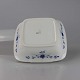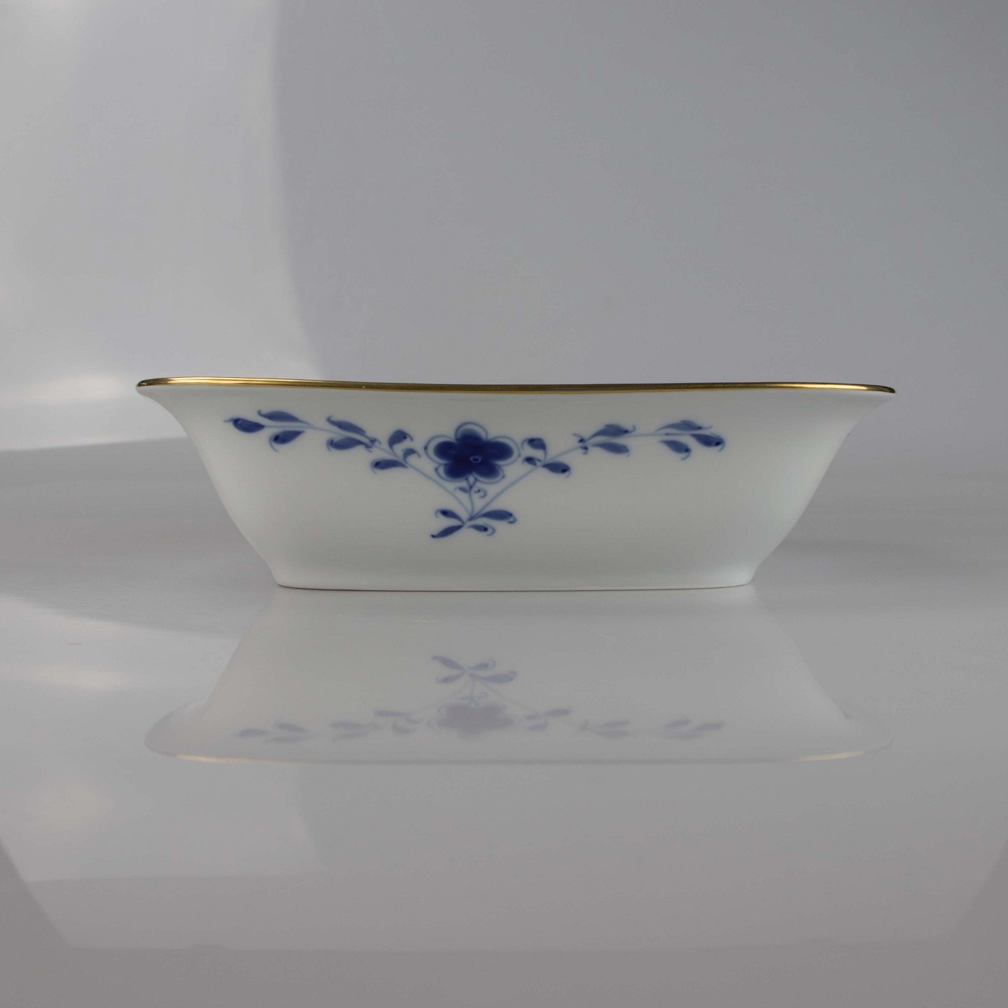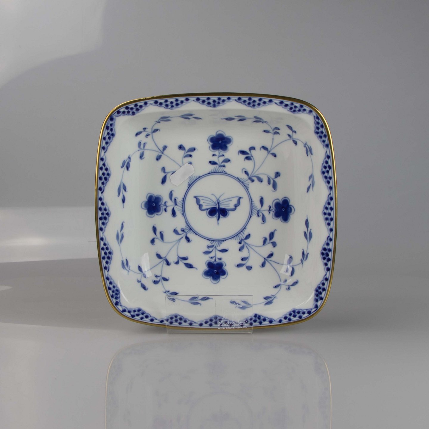 Kantet skål i hvidt porcelæn med guldkant med blå motiver af blomster og sommerfugle.