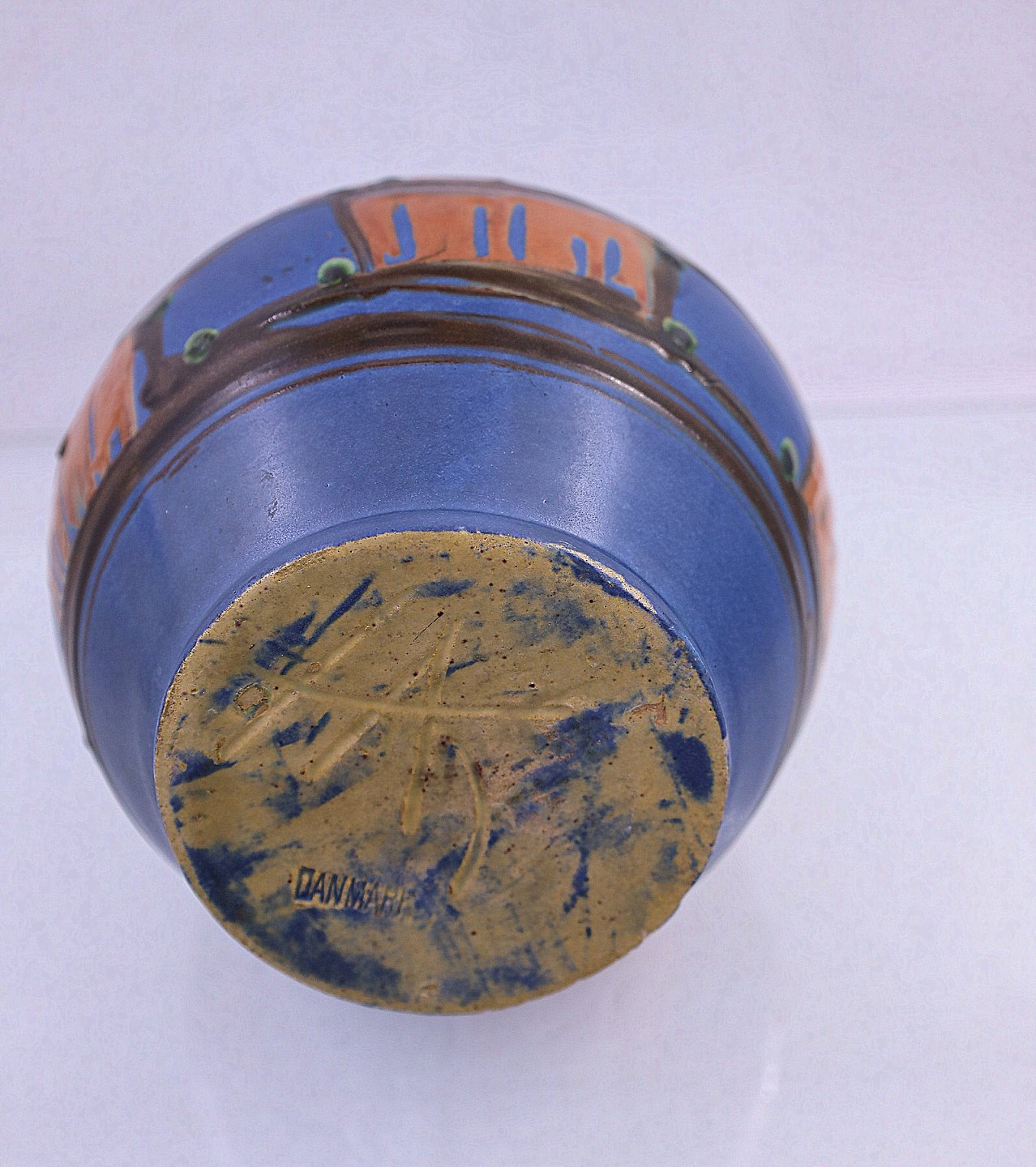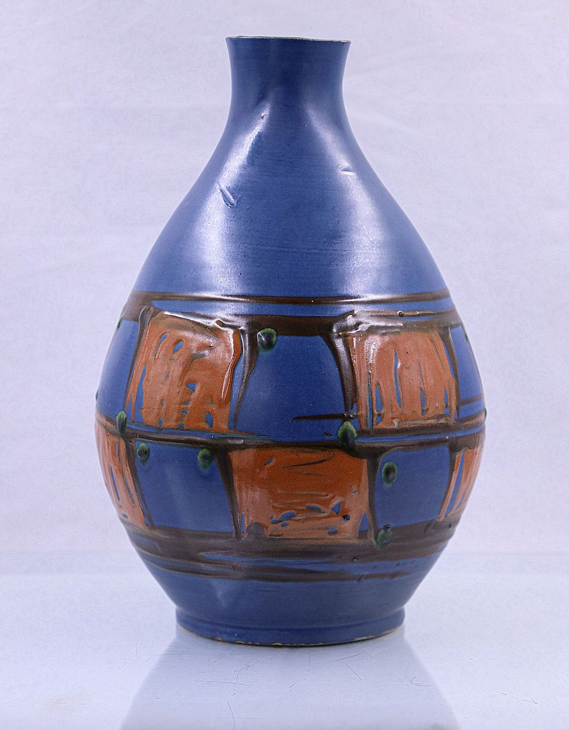 Herman A Kähler = HAK. Blåglasseret vase med brune tern